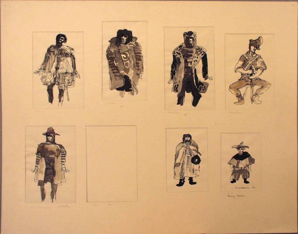 Sju skisser i två rader med resp namn under utförda i bruna nyanser och svart. Läkaren: man med rufsigt hår iklädd kort rock, stövlar, bär svärd. Gloucester: stor mörk luva (?) randig kort rock. Cornwall: Huvudbonad, kort rock med pälsbräm (?). En sittande man iklädd huvudbonad, skjorta med uppkavlade ärmar, kryss över bröstet, byxor och stövlar. Kent (förklädd): hatt med brynja under, kort tunika eller rock, randiga ärmar. En man med långt hår och skägg iklädd kåpa och svart stövlar, håller en hatt (?) i handen. Samt en figur iklädd narrmössa, kort kåpa , korta breda byxor svarta stövlar.