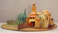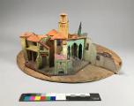 Modellen har fyra (?) scenbilder, som alla hänger samman. bild_a: ytterst på höger sida en beigefärgad mur med tillhörande låg fasad som har litet gallerfömster, fortsätter med en ljusgrön fasad som i vinkel har en mönstrad fasad med valv och pelargång in till en gulbrun kyrka med torn, på framscenen t v leder en smal trappa upp till en öppning i muren som har en vinklad trappa på andra sidan upp...