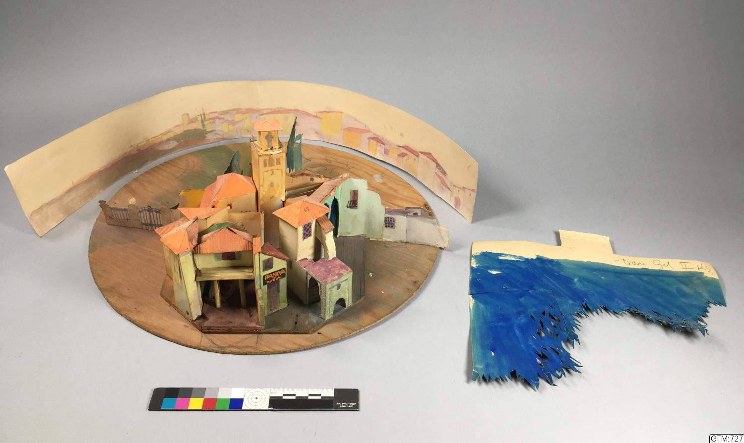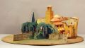 modellens delar av utskuren tunn kartong och trä är limmade mot och på varandra och på en tunn och delvis uppbyggd grundplatta formad efter en del av scenbilderna, den är, tillsammans med ytterligare ...