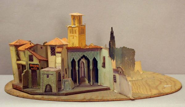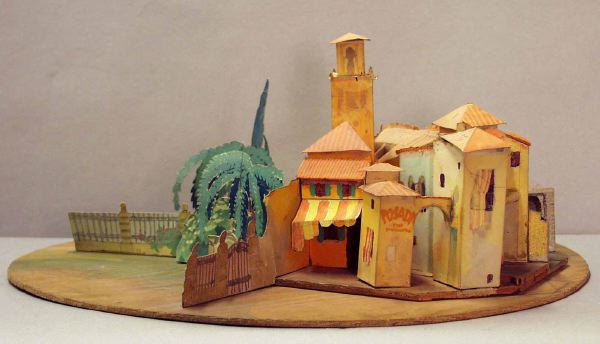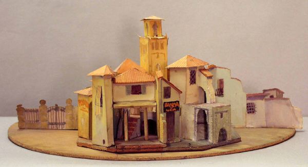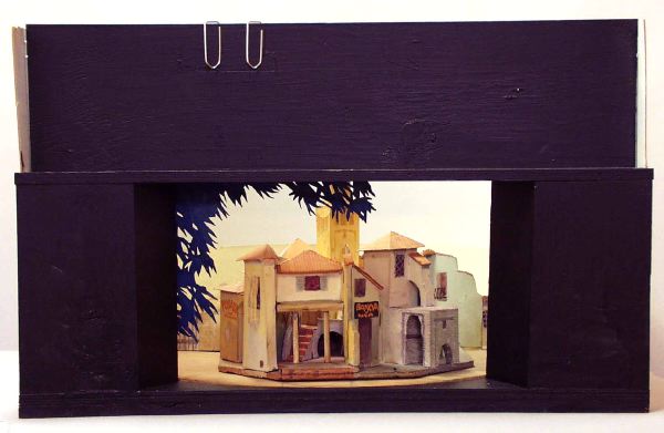 Modellen har fyra (?) scenbilder, som alla hänger samman. bild_a: ytterst på höger sida en beigefärgad mur med tillhörande låg fasad som har litet gallerfömster, fortsätter med en ljusgrön fasad som i vinkel har en mönstrad fasad med valv och pelargång in till en gulbrun kyrka med torn, på framscenen t v leder en smal trappa upp till en öppning i muren som har en vinklad trappa på andra sidan upp till en avsats ovanpå ett valv, valvet leder ut till nästa scenbild _b: med en smal gränd, intill den på höger sida en tillbyggnad med snedtak en skylt BANCA ovanför en brun dörr, till vänster därom två pelare som håller upp en gul fasad med innergård, trappa, portvalv och grönska, vägg i vägg är nästa scenbild _c: med ljusgul fasad, sammanbundet med ett mindre hus som har en valvbåge över en gränden som sammanhör med den i bild_b, det mindre husets vägg har en skylt POSADA, t v därom, något tillbakadraget, ett orangefärgat hus med två fönster på den utbyggda övervåningen som har en gul-och orangefärgad baldakin, över den bruna entrédörren på bottenvåningen, en ljusbeige mur med grind gränsar intill bild_d, som troligen är en park med gröna hängande trädkronor framför en mur i vinkel till den föreg., i bakgrunden en rostbrun mur med grönska hängande över. På tittskåpets proscenium på vänster sida finns blågröna nedhängande trädgrenar. I fonden mot den ljusblå rundhorisonten vy över en sydländsk stad med ljusa husfasader, tegeltak och grönska.