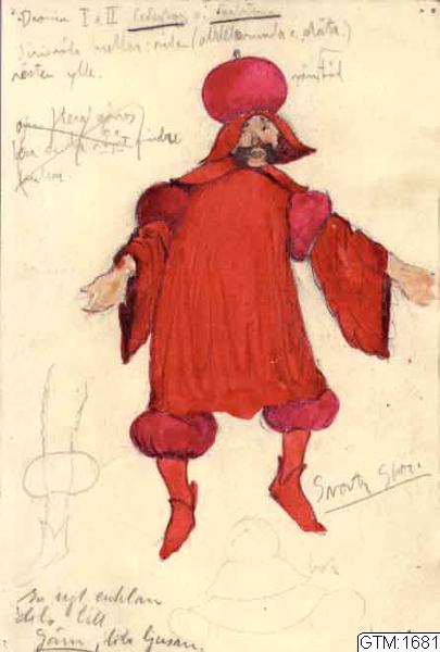 Man med mustasch, iklädd fantasifull röd huvudbonad(=äpple ovanpå en slokhatt), röd knälång vid tunika med liggande krage, puffärm vid axeln, vid nertill, påsbyxor över knät, röda strumpor, röda snabelskor.