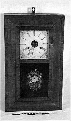 Rektanulärt mahognyfanerad trälåda med öppningsbar dörr. Överdelen består av en genomskinlig glasskiva. Nederdelen är en målad glasskiva med svart botten och en blomgrupp i blått, rosa, rött, grönt och gult. Liten mässingsknopp på dörren. Innanför glasskivan upptill finns den vitmålade urtavlan med romerska siffror och rocailler i hörnen. Inuti finns även pappersetikett med texten: "Eight Day...