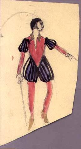 Man med ansiktet stående i profil och håller en värja i ena handen, iklädd svart kalott, rosa jacka med åtsittande liv, öppen i halsen med en gul krage, långa smala ärmar med kort slitsad puffärm i lila och svart, lårkorta puffbyxor i lila och svart, rosa trikåer, ljusbruna skor.