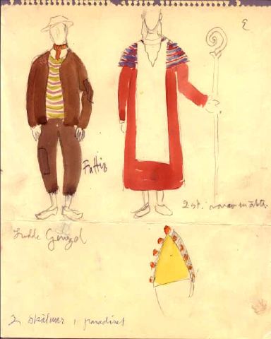 Två mansfigurer står intill varandra. Den t v är iklädd hatt, brun uppknäppt lappad rock och bruna ankellånga byxor med lappar på knät och fransade nertill, trätofflor, tvärrandig tröja i ljusgrönt, rosa och vitt, brun slips (?). Mannen t h är iklädd ankellång orangeröd kåpa med ett vitt fält framtill, tvärrandig krage ut över axlarna i rött, blått och vitt, han håller en kräkla i ena handen. Detaljskiss nertill på en "mitra" i gult och med orangefärgade bollar (?) på sidorna.