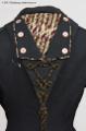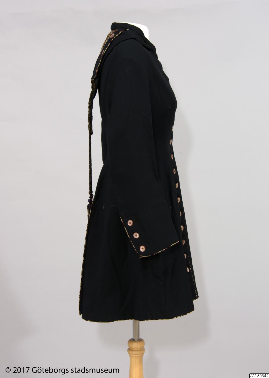 Från katalogkort: Damkappa; trekvartslång figursydd kappa i svart yllekypert. Släta tvåsömsärmar. Falsk huva sk burnus. Ytter-, ärmkanter, sprund samt ficklock kantade med passpoal av flerfärgad randig sidensatäng i brunt, öime, turkos, purpur, svart, rött m fl färger. Fram 16 knapphål och 15 knappar av brun och vit pärlemor, (den översta fattas). 3 knappar vid vart ärmsprund samt en på var sida om sprundet mitt bak. Huvan dekorerad med 6 knappar passpoaler och ett kilformat smockrynkat parti av tyg som i passpoalerna. Snörmakeridekor av kraftig melerad snodd i beige till brunsvart på huvan. Ändarna hänger ner och avslutas med tofs i vardera snoddänden.