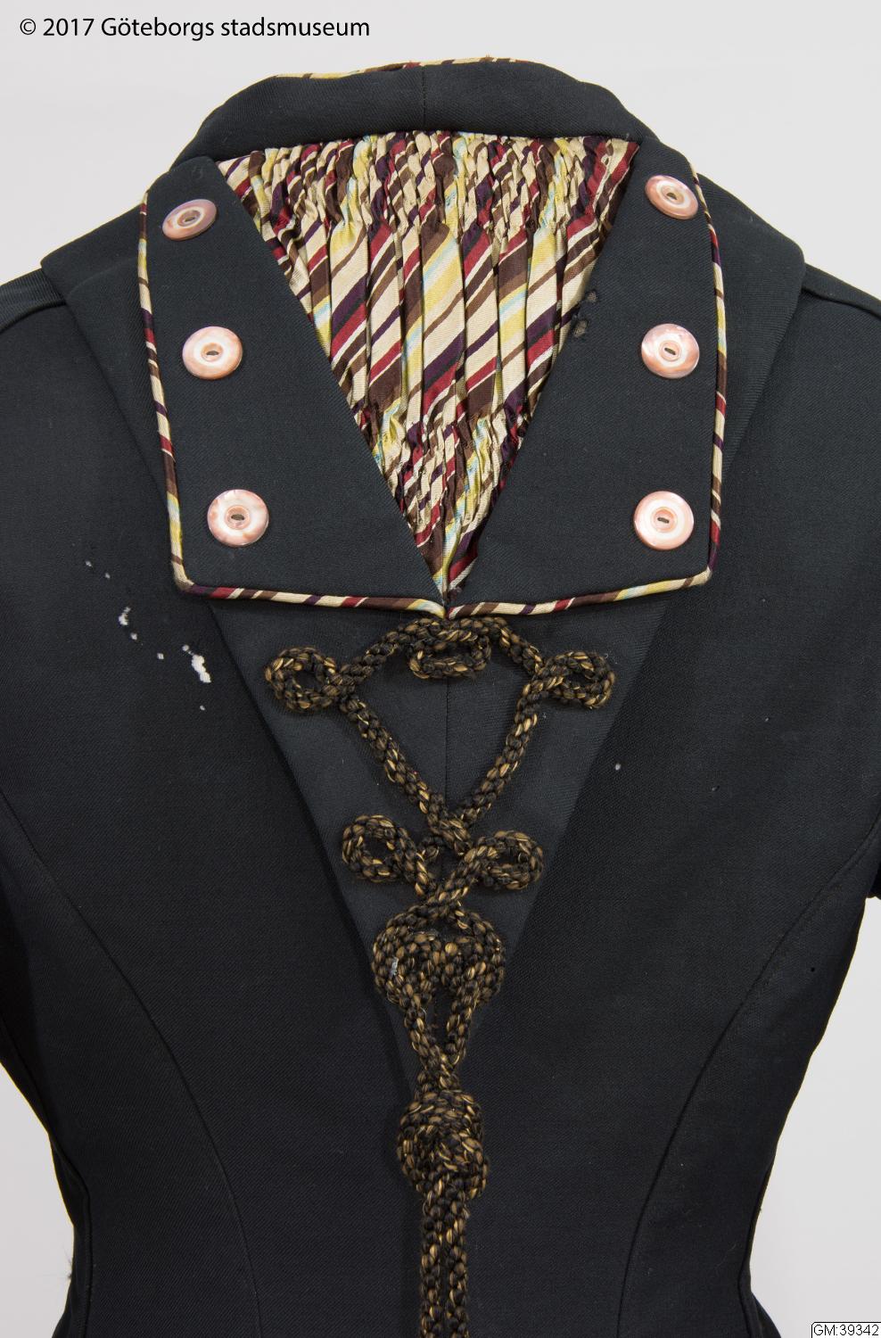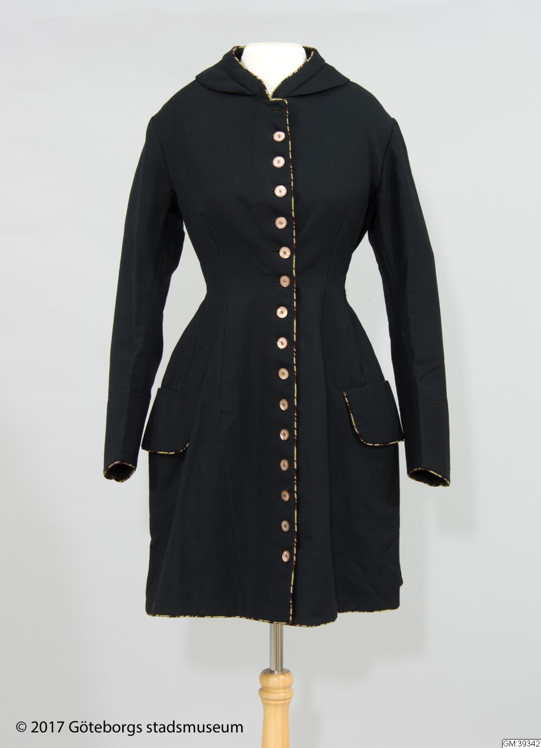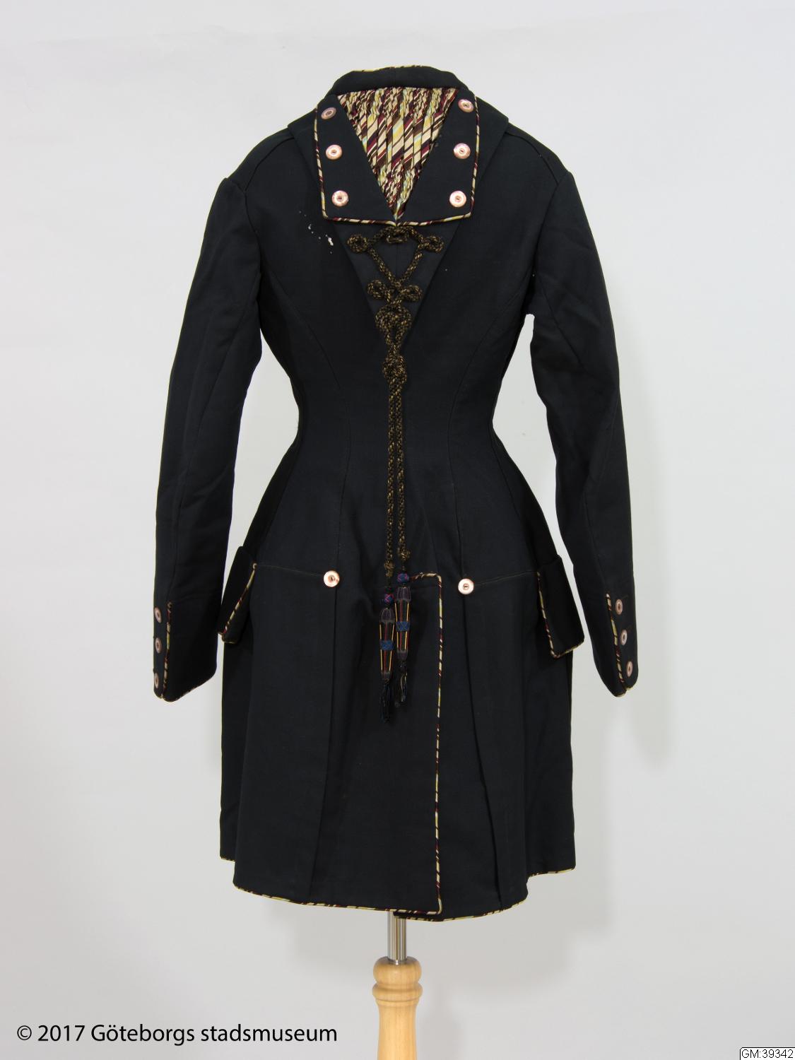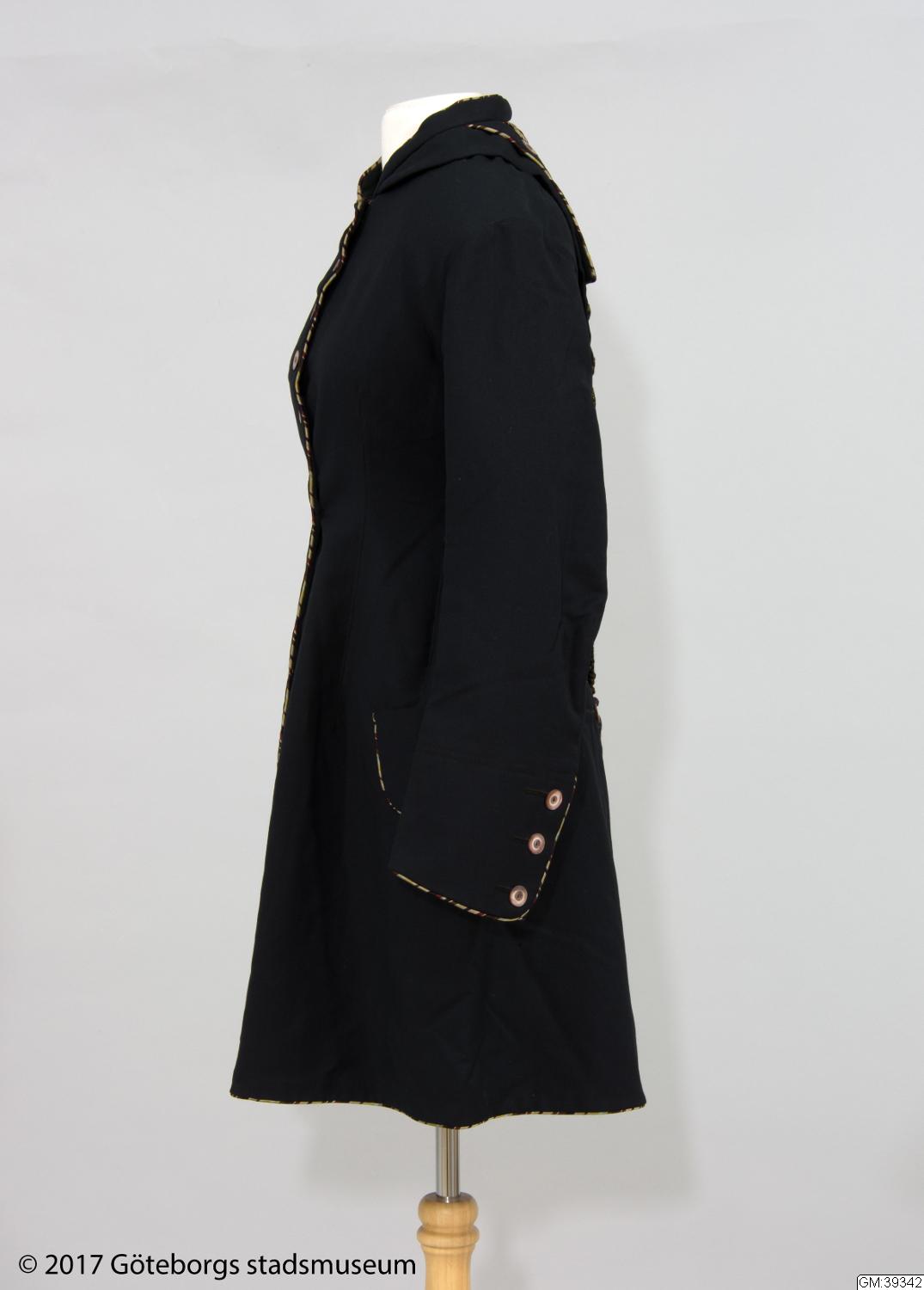 Från katalogkort: Damkappa; trekvartslång figursydd kappa i svart yllekypert. Släta tvåsömsärmar. Falsk huva sk burnus. Ytter-, ärmkanter, sprund samt ficklock kantade med passpoal av flerfärgad randig sidensatäng i brunt, öime, turkos, purpur, svart, rött m fl färger. Fram 16 knapphål och 15 knappar av brun och vit pärlemor, (den översta fattas). 3 knappar vid vart ärmsprund samt en på var sida o...