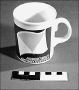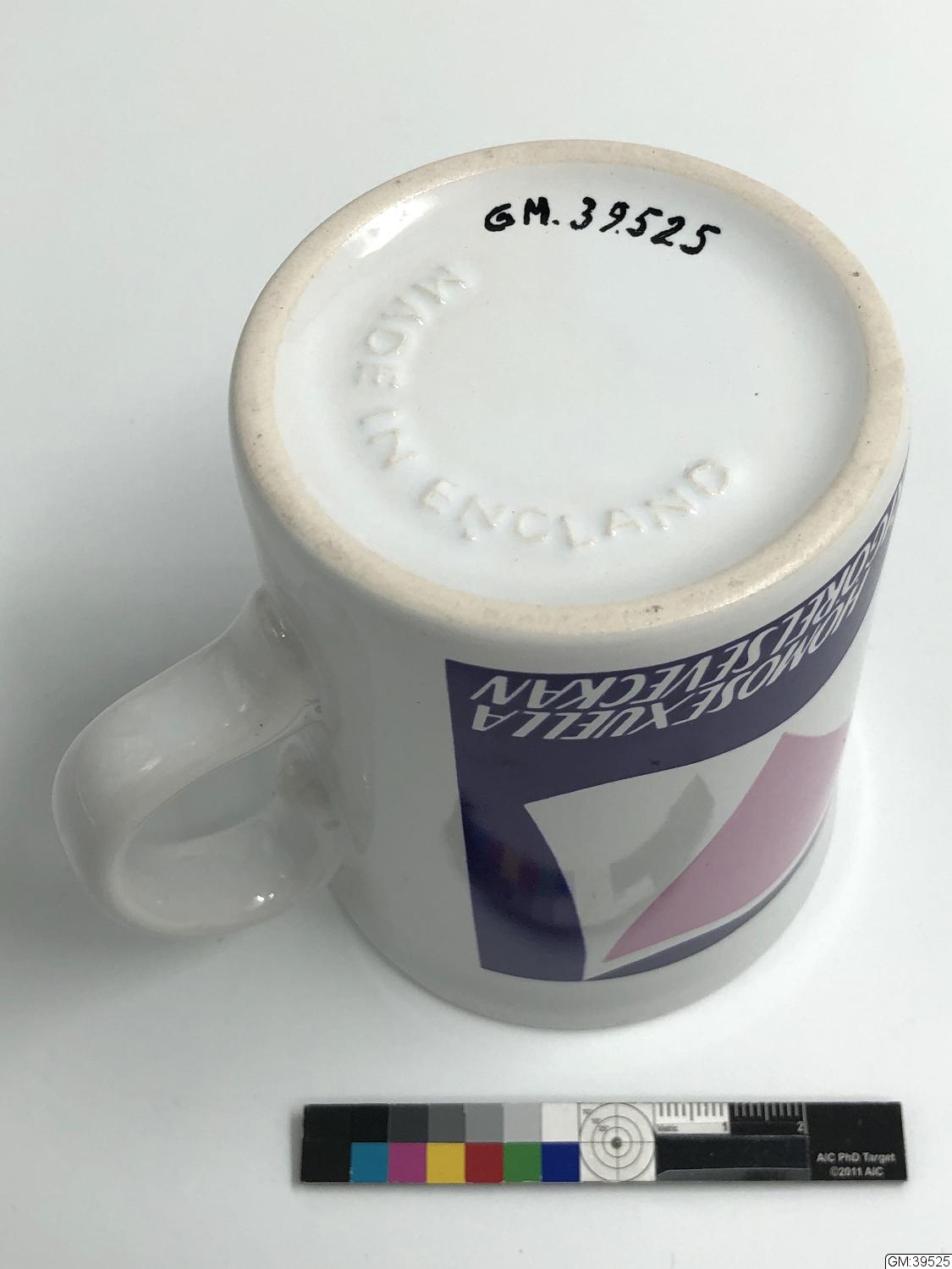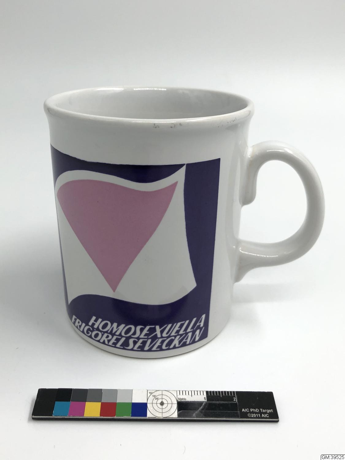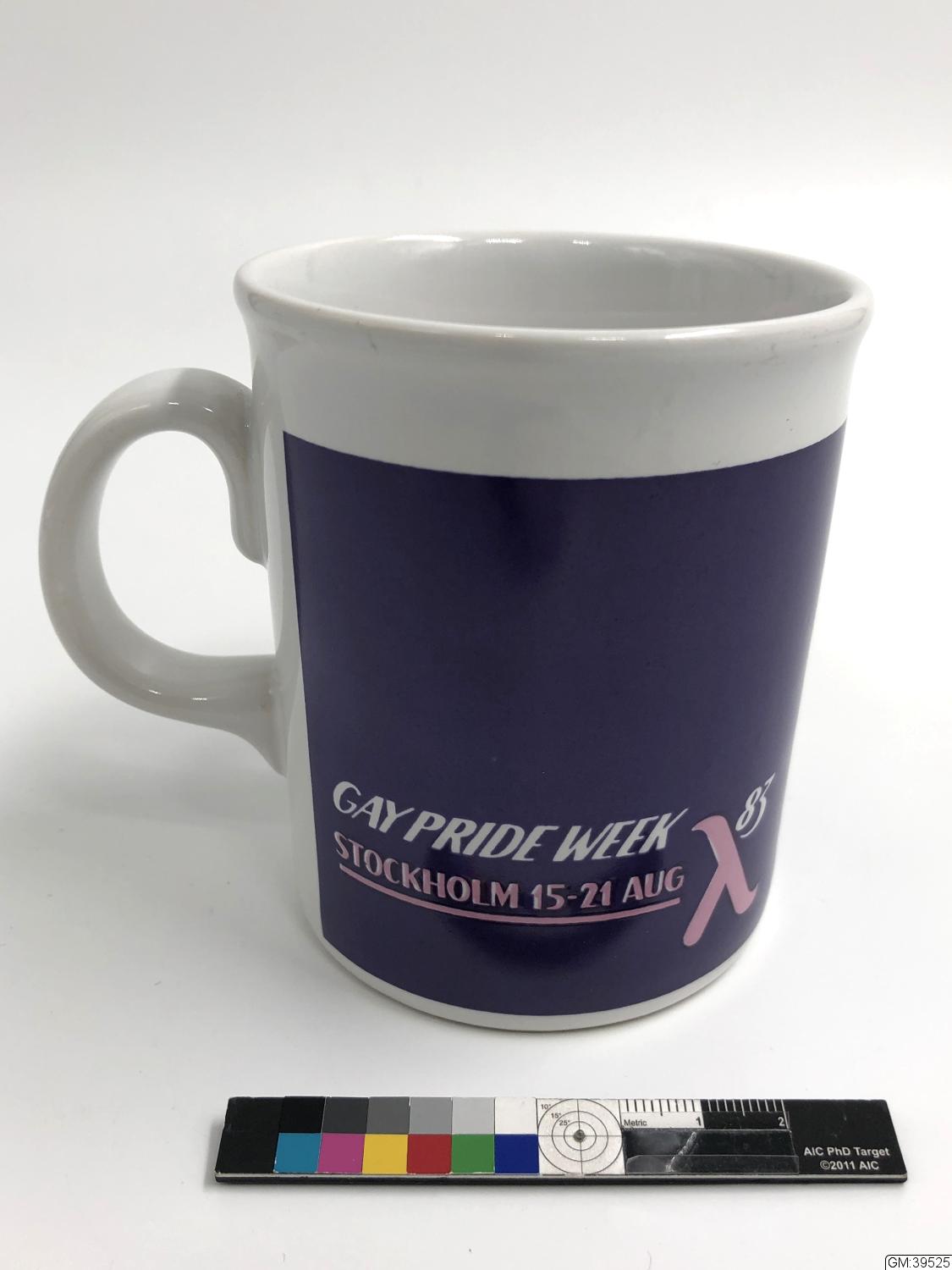 Vit keramikmugg med hänkek som är täckt av ett lila fält, i övrigt vit. Den återger en vit fana med en rosa triangel, ett rosa lambdamärke och texten "Gay Pride Week, Stockholm 15-21 aug 83, homosexuella frigörelseveckan" i rosa och vita bokstäver. Muggens botten har inskriften "Made in England".