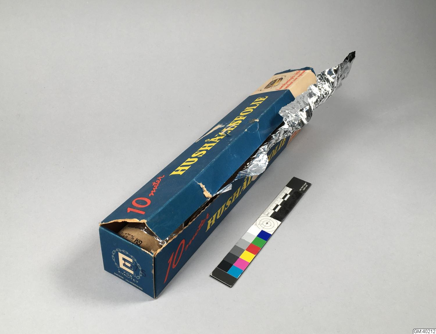 Hishållsfolie av metall, i ursprunglig förpackning: pappkartong med färgtryck, i blått, gult, rött och svart. Enligt påtryck svensk tillverkning, för EPA.