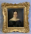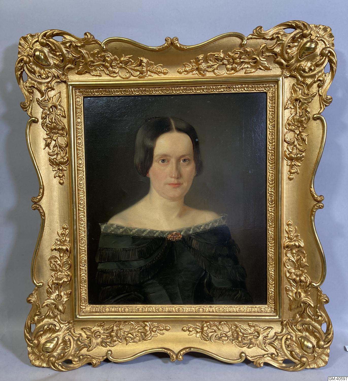 Tavla, olja på duk, porträtt - bröstbild av Maria Sofia Vougt 1814-1865 i Göteborg. Pendent till GM 40 596. Gift 1835 med grosshandlare Johan Olof Grén af Rossö - se föreg. nr. Svart urringad klänning, guldbrosch, gråbrun fond. Förgylld ram i nyrokoko. #Måtten: Yttermått 31 cm / Dagermått 36 cm