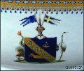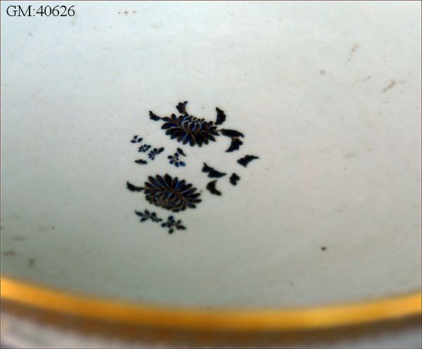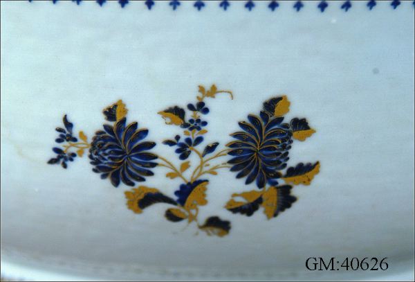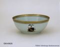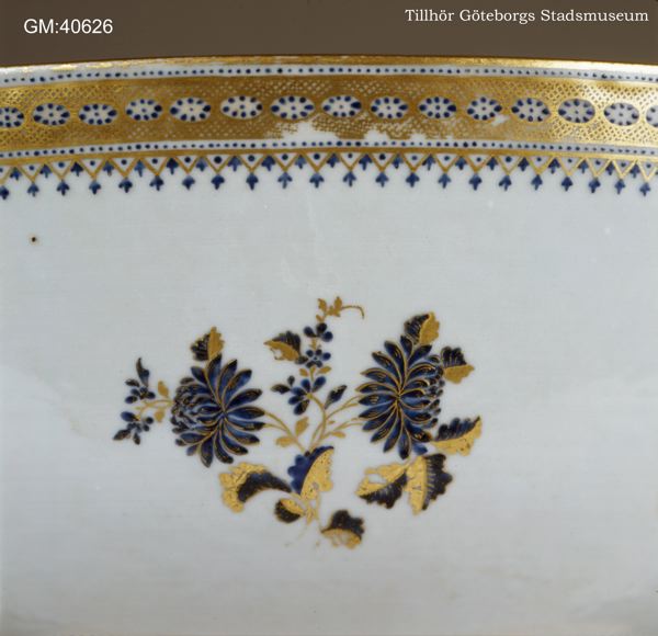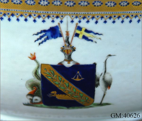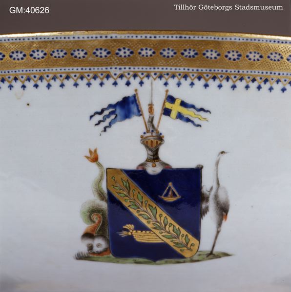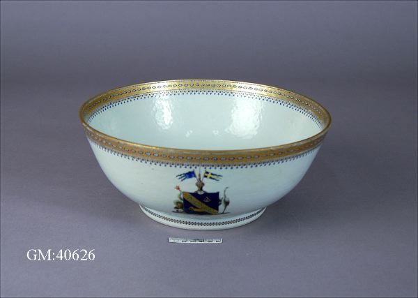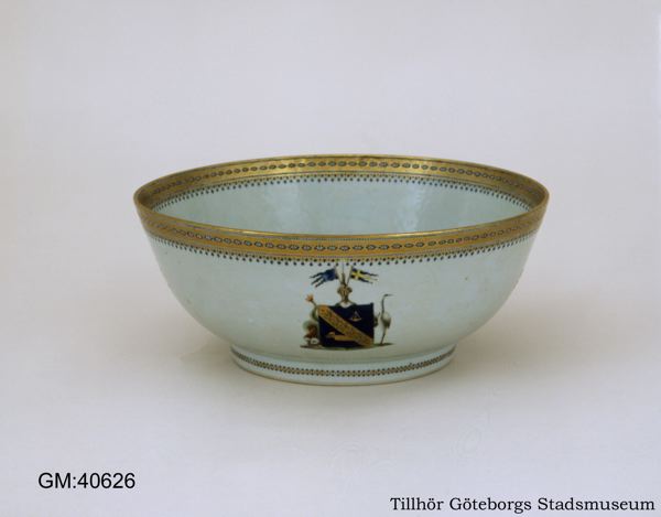 stor bålskål från Jiaqing-perioden, Qing-dynastin, i gråvitt porslin med af Wirséns vapensköld och crest i sepia, emaljfärger och guld på bägge sidor samt däremellan blombuketter i blått och guld samt bård i sistnämnda färger på bräddens in- och utsida och på fotringen en smalare variant.
