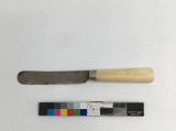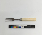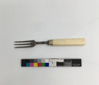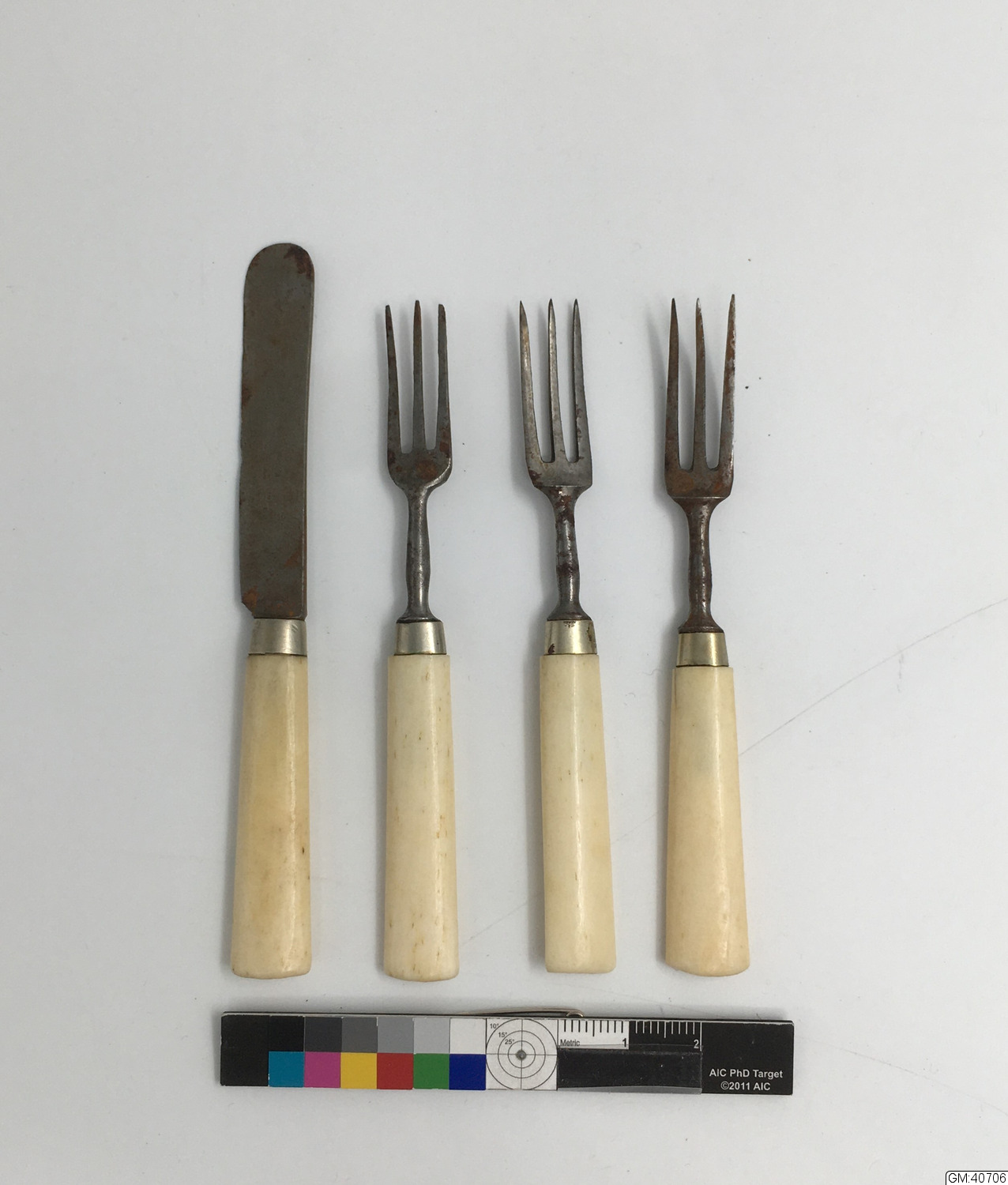 Dockbestick, 4 st med benskaft. 1) Kniv 2-4) gafflar, trehornade.