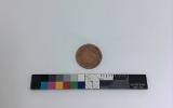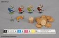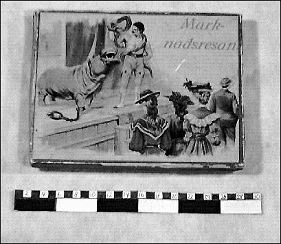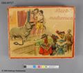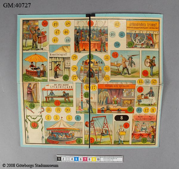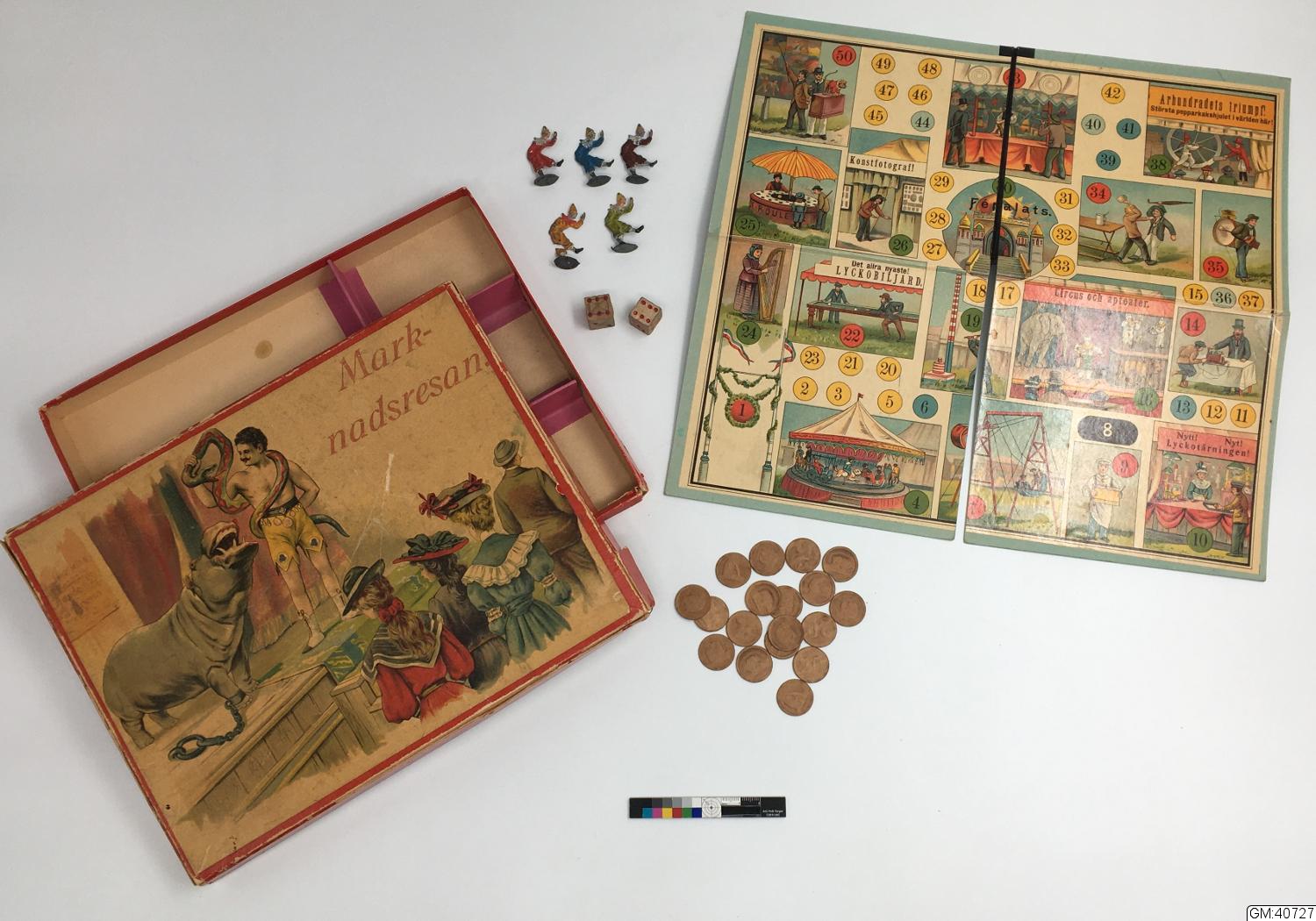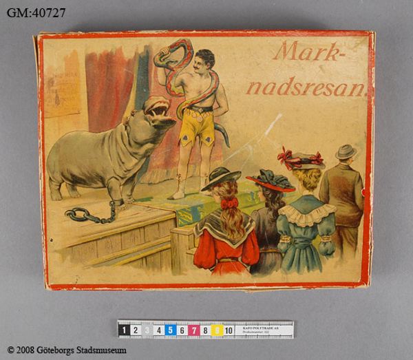 Sällskapsspel "Marknadsresan" Röd pappask med poykromt lock, tryckt bild.#1) Spelplan, 29,5 x 31,5 cm ihopvikbar till 1/4, av grön papp med påklistrat polykromt tryck med 50 stationer därav 18 med illustrationer: olika markandsnöjen - positivhalare, prickskytte, lyckohjul, roulette, biljard, karusell mm. #2) Tärning av trä med röda prickar, 1,4 cm/sida. 3-7) Markörer i form av pajasfigurer gjutna i tenn och målade i olika färger, 3,7 cm höga; en färg för varje spelare. En figur skadad - bruten i två delar (nr 6). #8-25) Spelmarker - runda "mynt" i mönsterpräglad brun papp: olika valörer på åtsidan, olika djur på framsidan; 1,9 cm i diameter. #26) Kartong med lock vari spelet förvaras. På locket cirkusartist med orm och flodhäst inför publik; inredd med fyra fack. #På undersidan skrivet med blyerts: "Greta Karlsson julafton 1911". Spelregler på lockets insida. #Kartongen något skadad och nött.