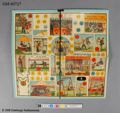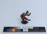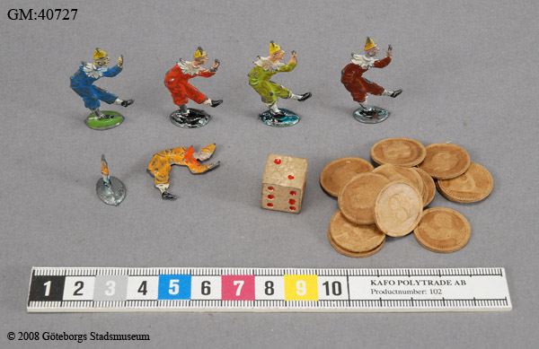 Sällskapsspel "Marknadsresan" Röd pappask med poykromt lock, tryckt bild.#1) Spelplan, 29,5 x 31,5 cm ihopvikbar till 1/4, av grön papp med påklistrat polykromt tryck med 50 stationer därav 18 med illustrationer: olika markandsnöjen - positivhalare, prickskytte, lyckohjul, roulette, biljard, karusell mm. #2) Tärning av trä med röda prickar, 1,4 cm/sida. 3-7) Markörer i form av pajasfigurer gjutna ...