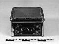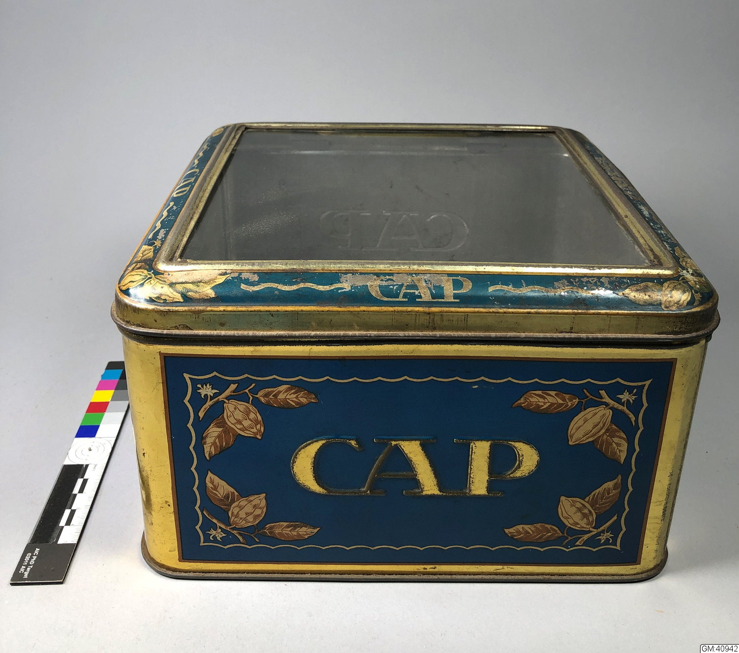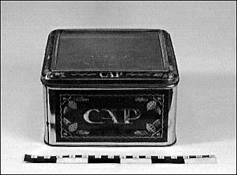 Blå- och guldfärgad plåtburk med "CAP" inskrivet på alla fyra sidorna, blad ornament. Glaslock. Varje långsida har sin blåa fyrkant med texten och bladornament i guldfärg.