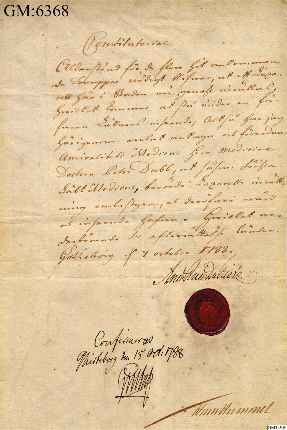 Constitutorial Aldenstund för de flere hit ankommande Troupper nödigt blifwer att ett Lazarett här i staden nu genast inrättas, hwilket kommer att stå under en förfaren läkares inseende; altså har jag härigenom welat antaga och förordna Amiralitets Medicus Herr Medicine Doctorn Pehr Dubb, att såsom förste FältMedicus, berörda Lazaretts inrättning ombestyra och deröfwer wård och inseende hafwa hwilket wederbörande til efterrättelse länder. Götheborg d. 7 october 1788. And:Rud:DuRietz. Confirmeras Ghiöteborg den 15 oct: 1788 Gustaf /Hans Hummel