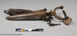 Krusningspipjärn. Pipkragen är modern i början av 1600-talet. För att den ska få rätt utseende behöver den formas. Pipjärnet hettas upp och sätts fast i bordskanten. Sedan träs kargens tygpipor på, en efter en. (GM:6738, GM:6739) [Göteborgs stadsmuseum, 2017]