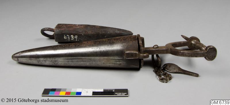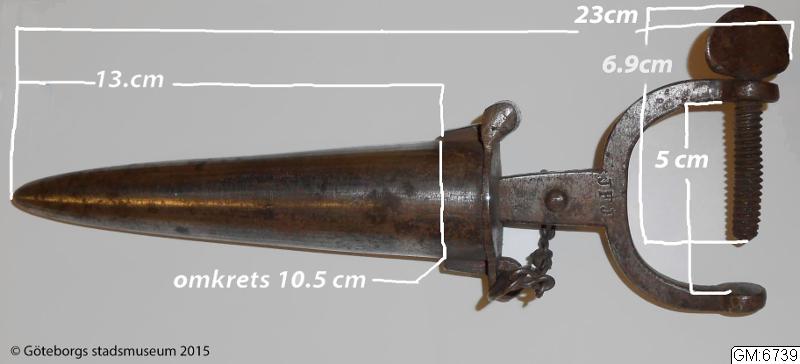 Goffering iron. Neck ruffs were fashionable at the begining of the 1600s. To make a neck ruff look right, it had to be shaped. The goffering iron was heated and attached to the edge of a table. Then the individual fabric pockets of the ruff were pulld over the iron one by one. (GM:6738, GM:6739) [The Birth of Gothenburg, 2017]