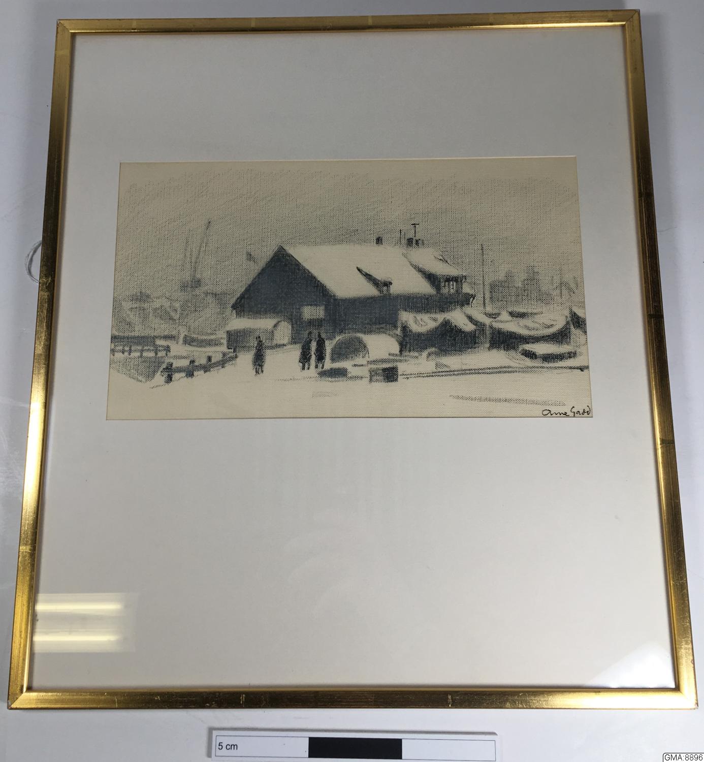 • Svartkrita av Arne Gadd 1959, 16,5 x 29 cm, Ostindia kompaniets gamla magasin vid Klippan , vinter.