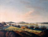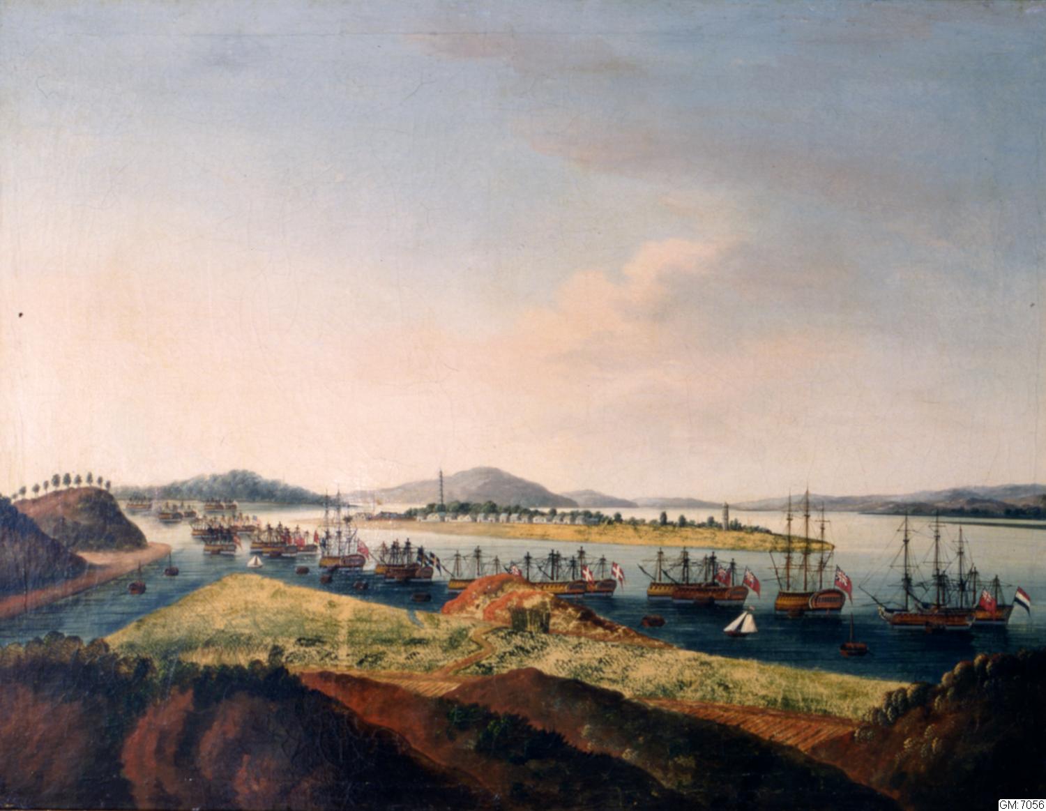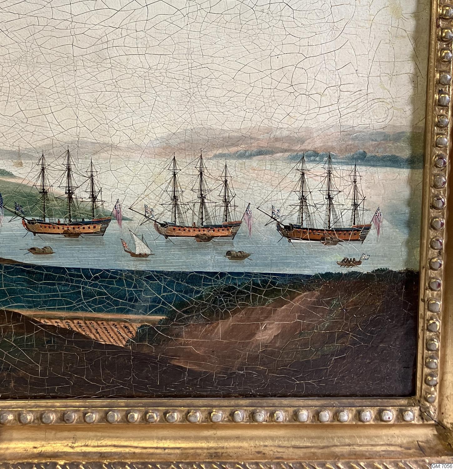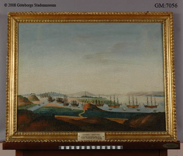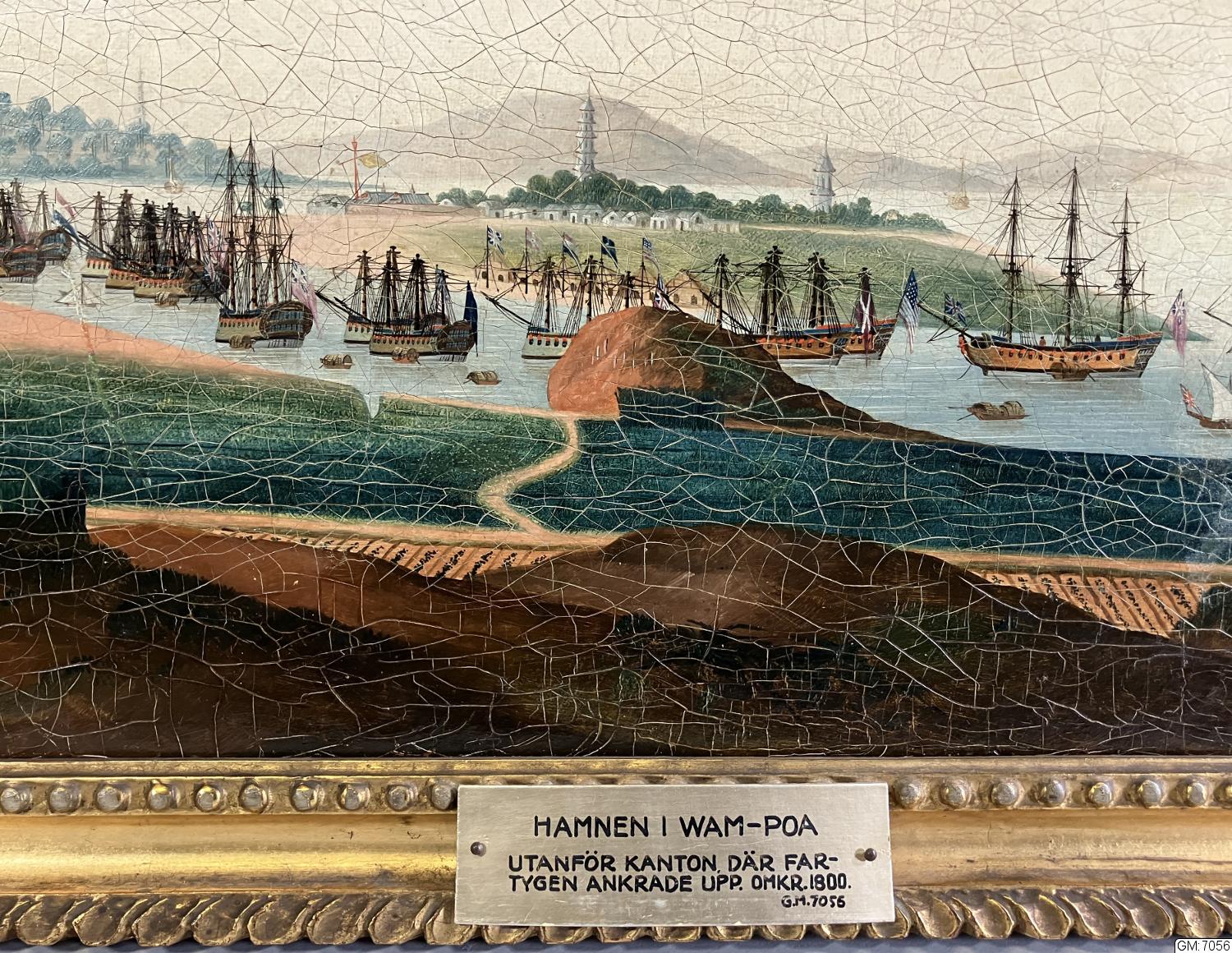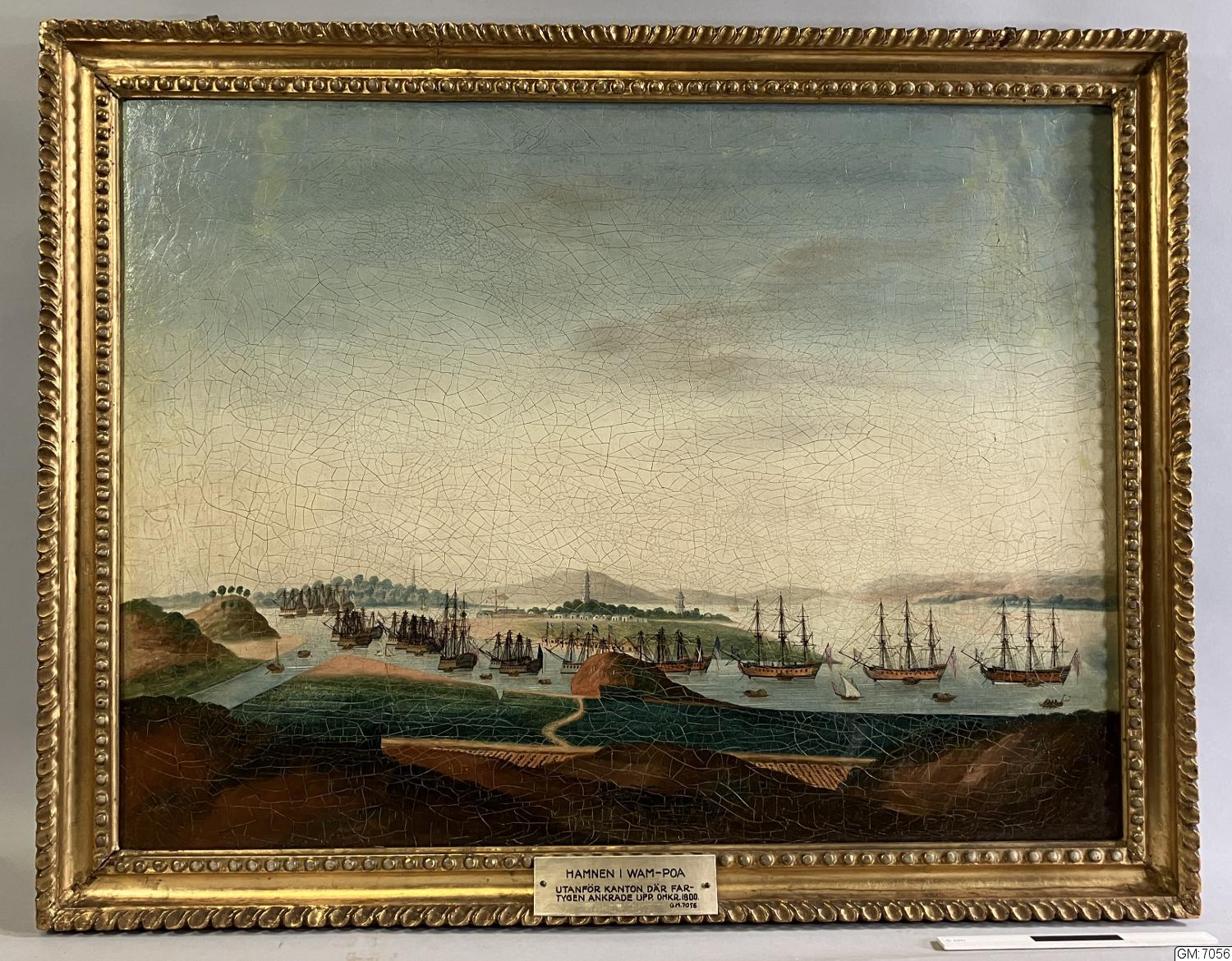 • "HAMNEN I WAM-POA" utanför Kanton där fartygen ankrade upp vid 1700-talets senare del och början av 1800-talet. Olja på duk med förgylld träram.