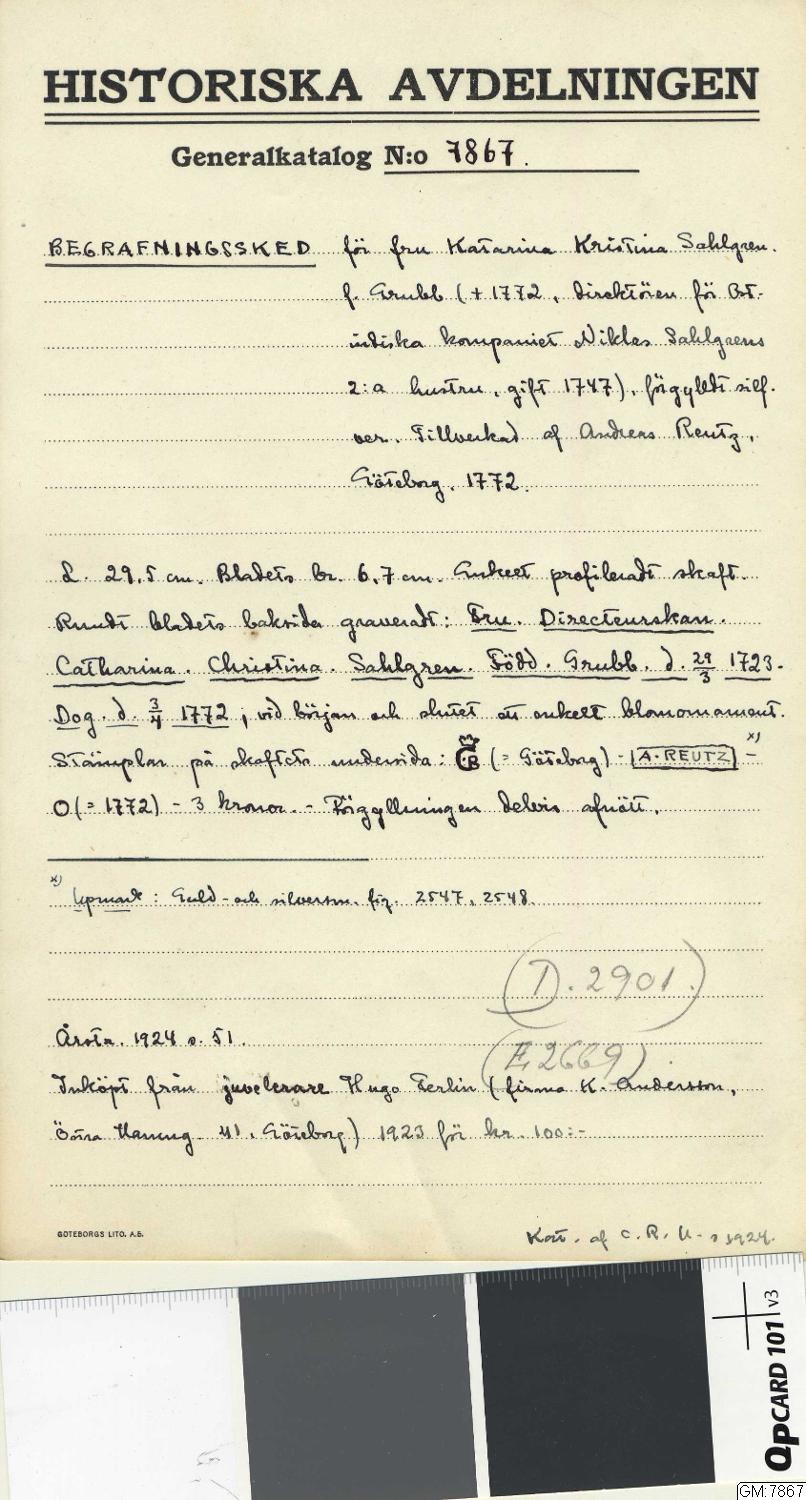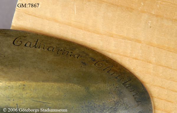 Beskrivning: förgylld silversked som är nästan dubbelt så stor och lång som en vanlig matsked, den ser ut på det viset då den skulle användas att lägga upp mat med, denna sorts serveringsbestick kallades förr i tiden för förläggare. Skeden har en graverad text som skall påminna om den döda Catharina Christina Sahlgren som dog år 1772. Familjen Sahlgren var en av det svenska 1700-talets inflytelserikaste och mest förmögna släkter. Den stora förmögenheten kom huvudsakligen från den omfattande handel som deras företag bedrev under 1700-talet. Det var inte ovanligt att vid förnäma personers begravningar, från 1600-talets andra hälft till långt in på 1800-talet, utdela begravningsskedar som minne till vissa gäster och kanske också till dem som hjälpte till med begravningen.