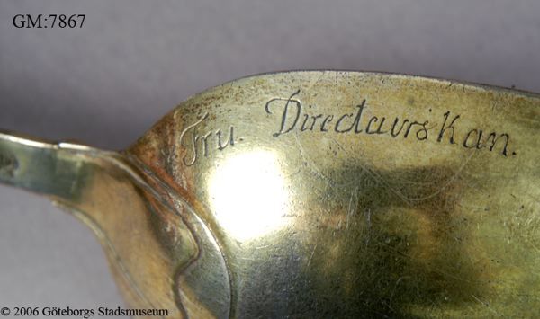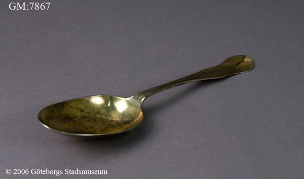 Beskrivning: förgylld silversked som är nästan dubbelt så stor och lång som en vanlig matsked, den ser ut på det viset då den skulle användas att lägga upp mat med, denna sorts serveringsbestick kallades förr i tiden för förläggare. Skeden har en graverad text som skall påminna om den döda Catharina Christina Sahlgren som dog år 1772. Familjen Sahlgren var en av det svenska 1700-talets inflytelse...