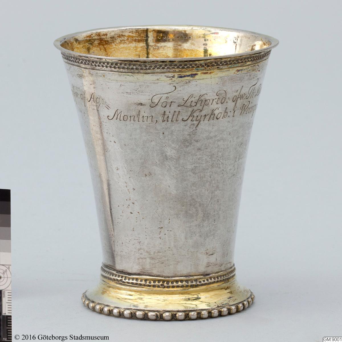 • bägare av silver vilken delvis är förgylld på utsidan, insidan är helt förgylld, på bägarens liv finns följande inskription: "För Likspred:Öfw:"Th:Doctr.:Contr:Probst:och Kyrkoh: i Tanum, M J Ekström, gifw: af Ag: Montin, till Kyrkoh: i Weinge, Magister Joh: Did: Alsing d: 27, Jun: 1778"