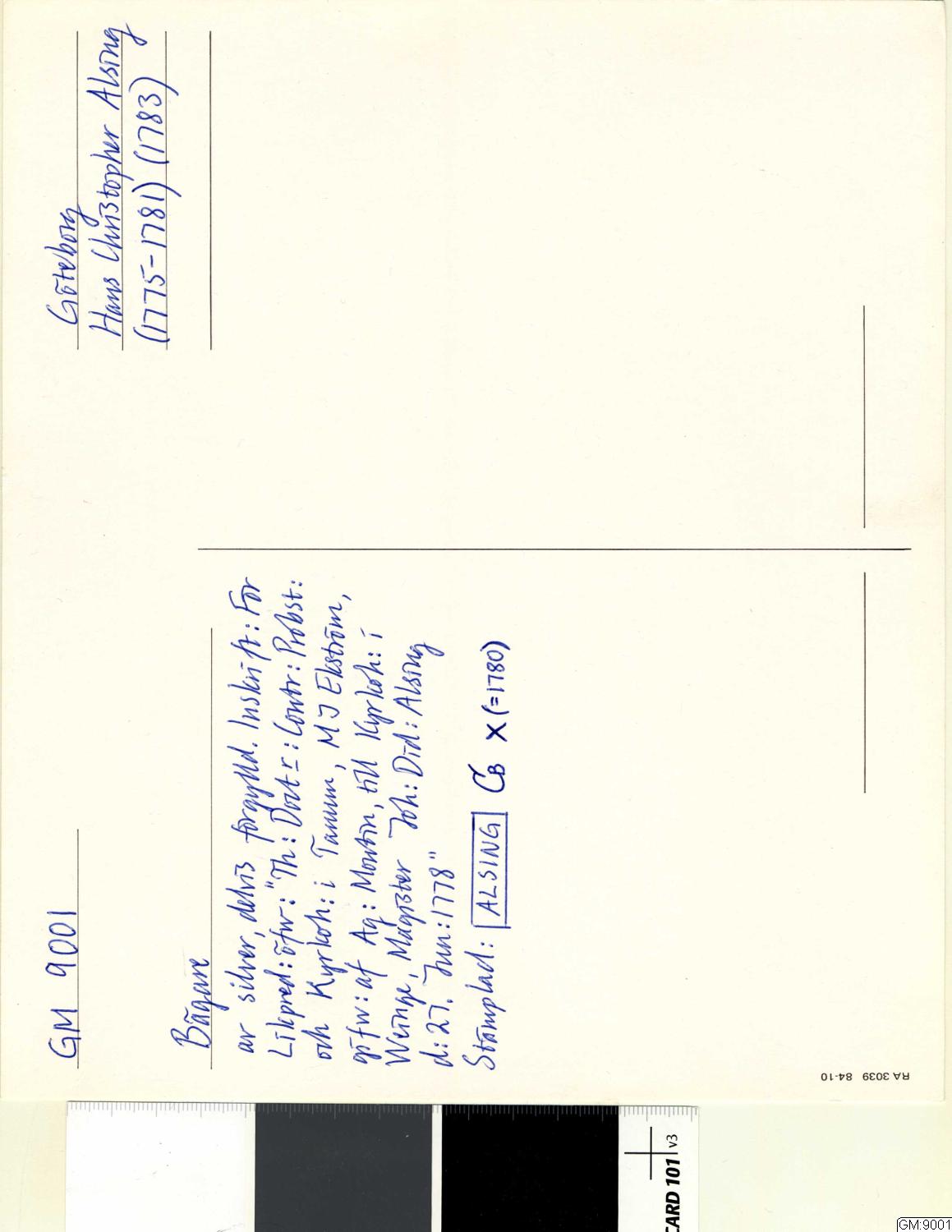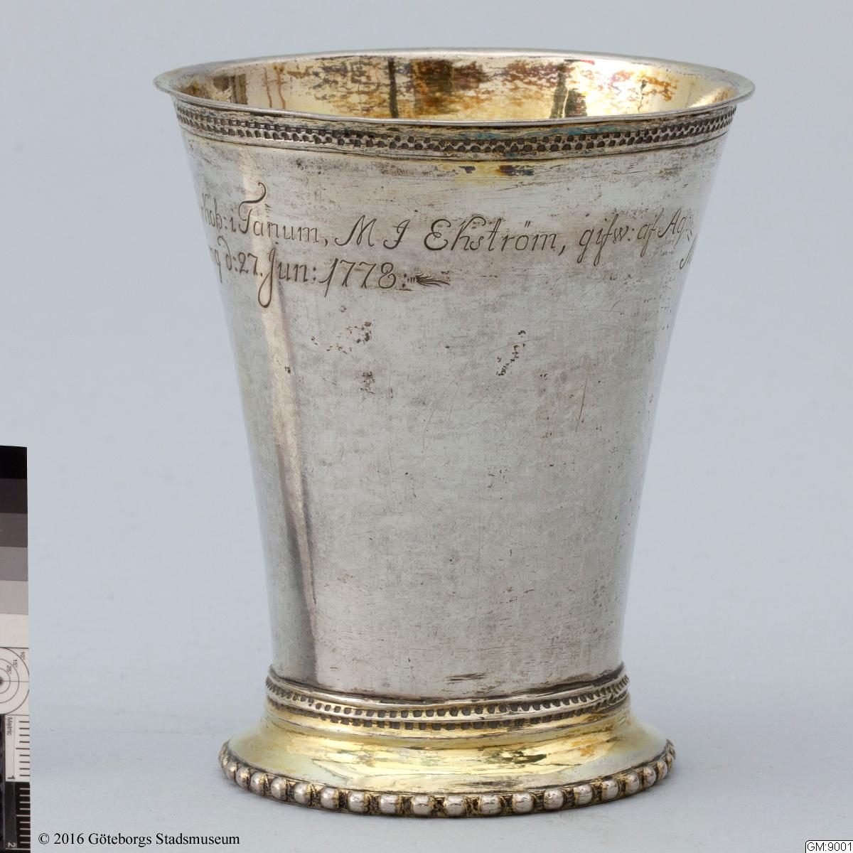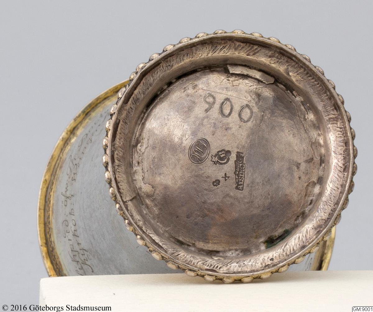 I botten av bägaren finns följande mästarstämplar: Alsing (Hans Christopher Alsing) GB (Göteborg) X=1780