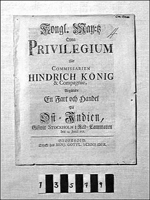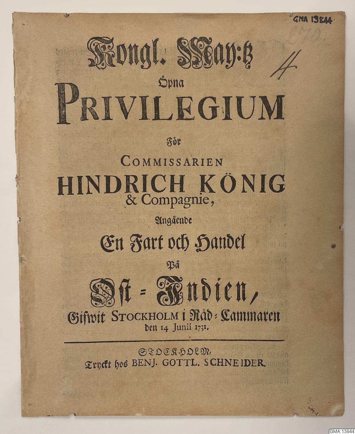 • "Kongl. Maj:ts öpna Priviligium för Commissarien Hindirich König & Compagnie angående En Fart och Handel på Ost-Indien givit Stockholm i Råd-Cammaren den 14 junii 1731" Tryckt 4-bladig folder.