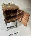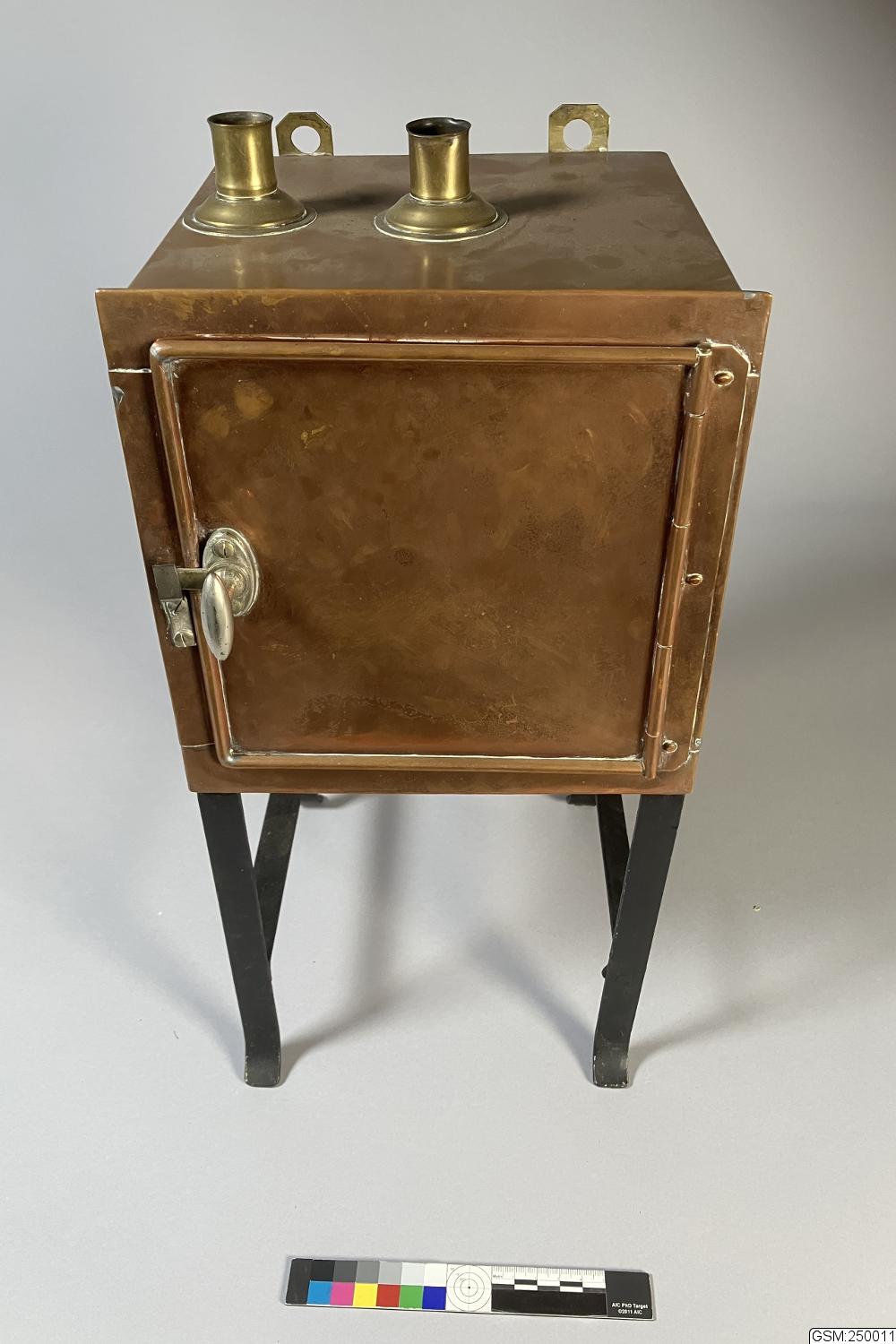 Ett värmeskåp/torkskåp i koppar, som står på en ställning med fyra ben. Inredningen har en kopparplåt med hål där provrör eller liknande kan hängas. Skåpet har använts i biologi- och kemiundervisningen på Sigrid Rudebecks skola i Göteborg, kanske ända fram till 1969, för att torka eller värma biologiskt material och/eller kemiska ämnen. Skåpet värms upp med en bunsen- eller gasolbrännare.