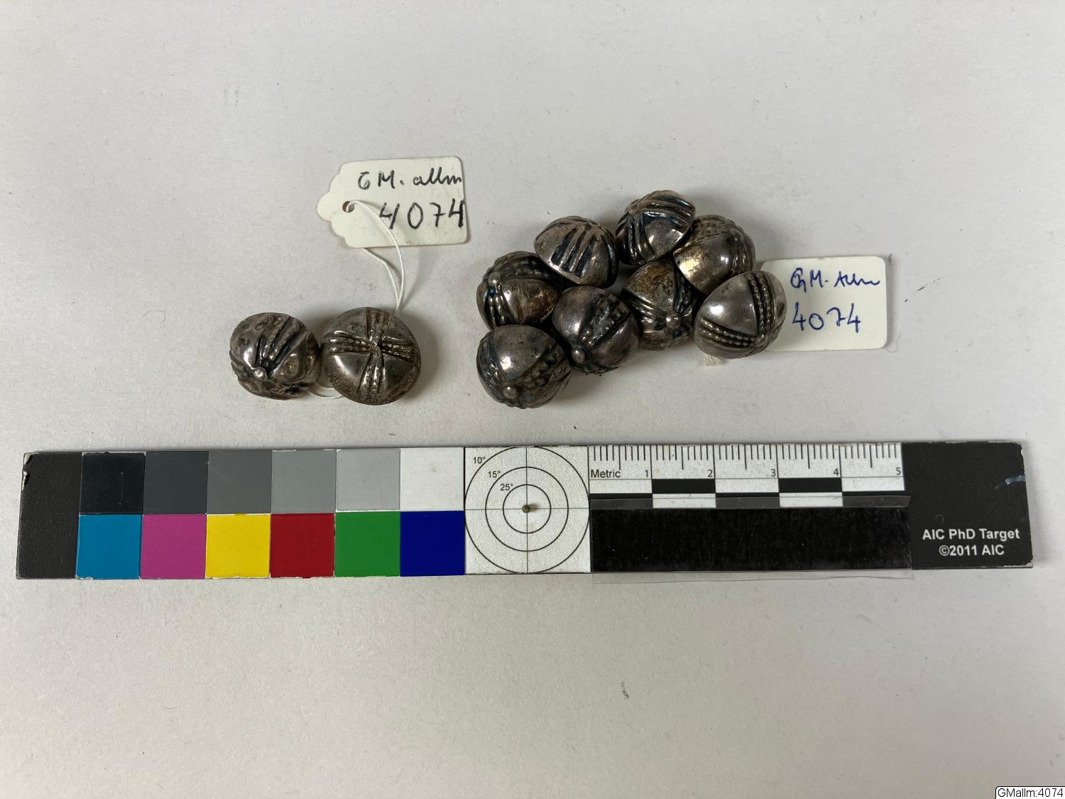 • silverknappar formade som ihåliga halvklot med punsad relieffdekor och ögla på den flata undersidan.