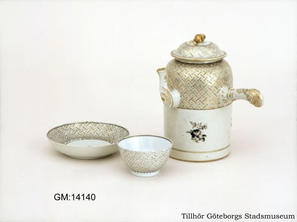 kaffekanna med kopp och fat Ostindiskt porslin, 1700-tal. GM:14140