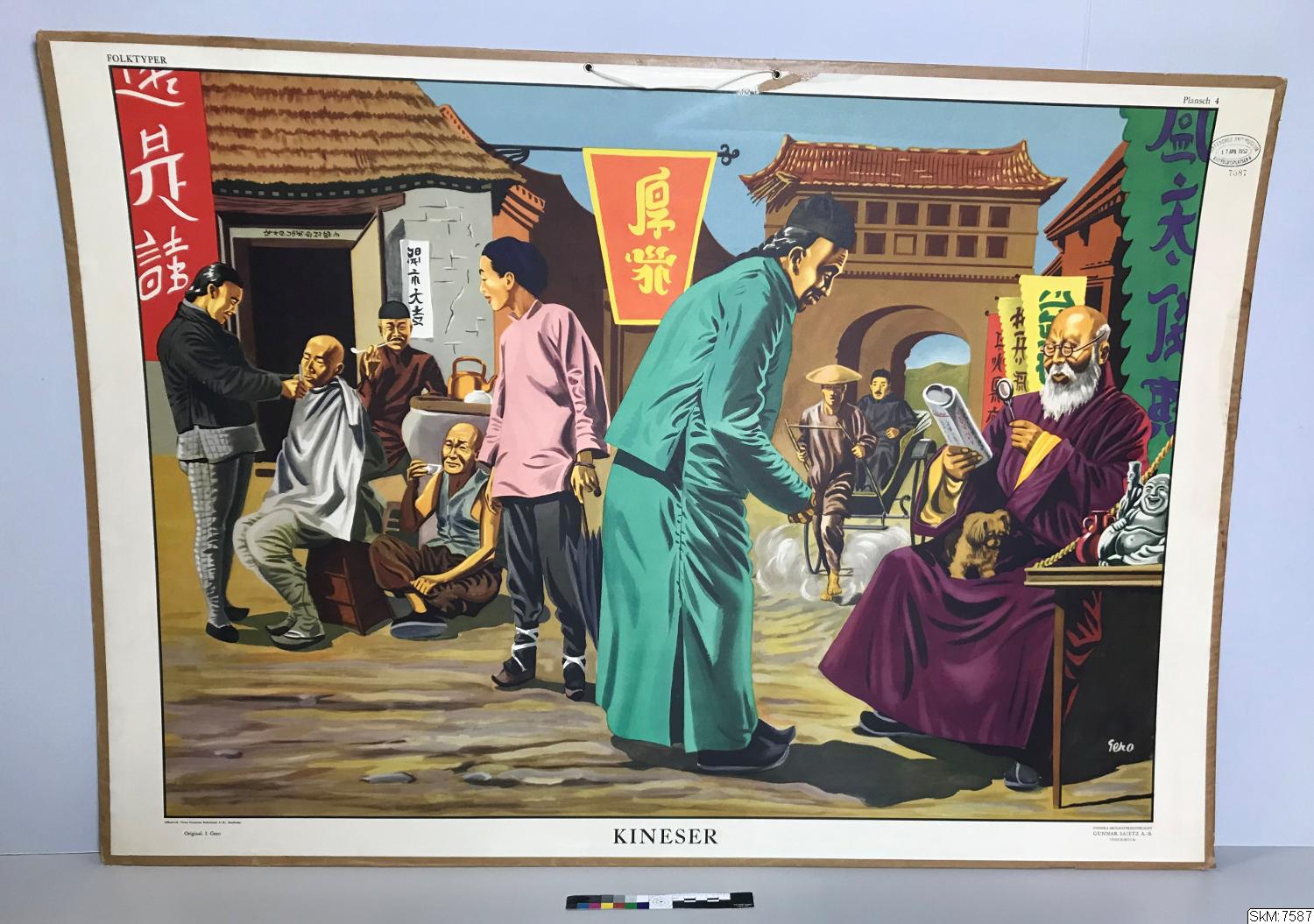Motiv:"Kineser", polykrom bild.Serie: Folktyper plansch 4. Bilden signerad "I Gero". Text på baksidan se bilaga i pärm. Fuktskadad