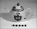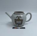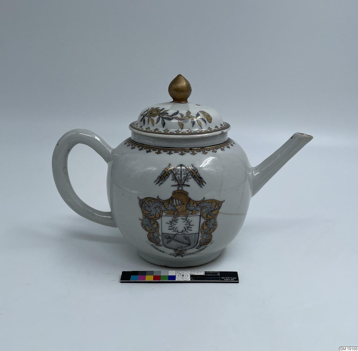 • Tekanna med lock och vapen: Ankarcrantz. Guldfärgad knopp på locket. Dekor i guld och sepia.