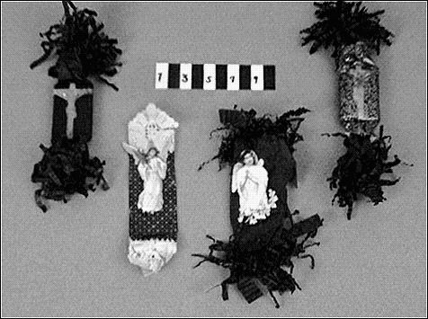 • Papperskaramell-begravningskonfekt. Platta, gjorda i modell á la julgranskaramell med fransar och påklistrade bokmärken i krucifix och änglar. 2 st försedda med tryckta deviser.##