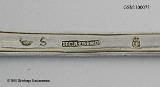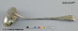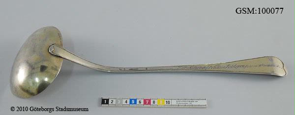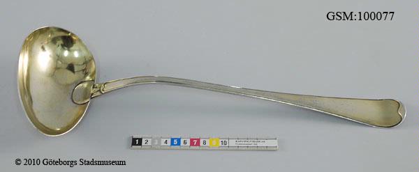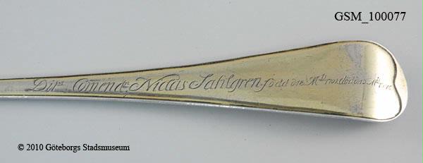 soppslev, helt förgylld, sliten som följd av användning, lagad vid skopans kant. På frånsidan av skaftet inskription: Dir.n, (Direktören) Commend.n (Commendören) Niclas Sahlgren född d:18 M ts (Mars)1701, död d:10M ts (Mars)1776. Kontrollstämplar: Trekronorsstämpel (statlig kontroll) S=1776, H.C.Alsing (Hans Christoffer Alsing) GB under krona (stadsstämpel Göteborg)