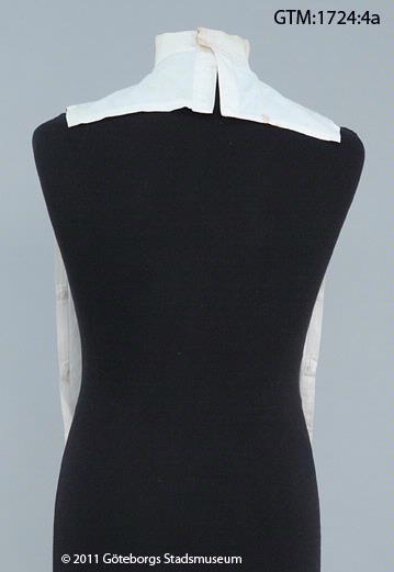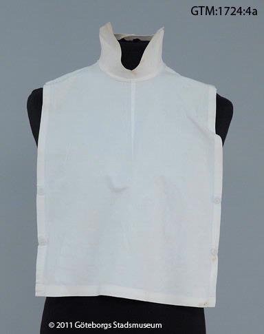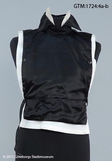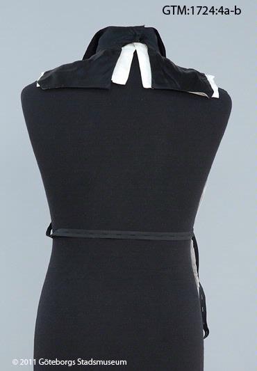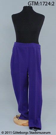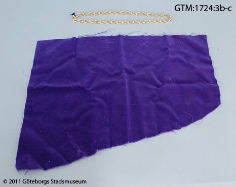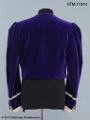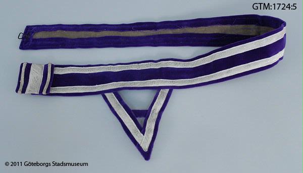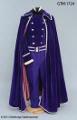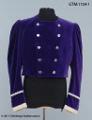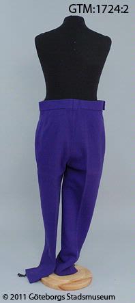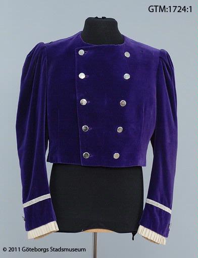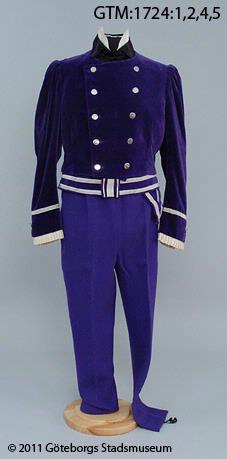 8 delobjekt: 1: Jacka 2: Byxor 3a: Cape, 3b: tygbit, 3c: kedja 4: Skjortbröst; a: vita skjortbröstet, b: svarta skjortb. 5: Skärp /lzg 2011-11-01 "Kostym bestående av jacka, byxor, skärp och två lösbröst. Jacka sydd i lila sammet 51 cm lång, dubbelknäppt med vita metallknappar. Ärmen har en silverbård och ett veckat fräs vid handleden sytt av vitt bomullstyg. Jackan är fodrad och har ett märke ef...
