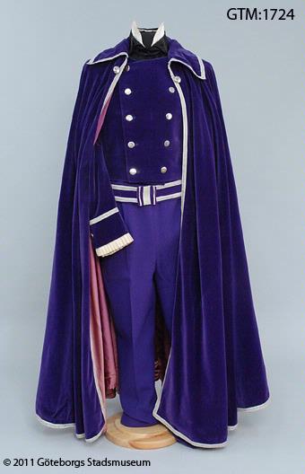 8 delobjekt: 1: Jacka 2: Byxor 3a: Cape, 3b: tygbit, 3c: kedja 4: Skjortbröst; a: vita skjortbröstet, b: svarta skjortb. 5: Skärp /lzg 2011-11-01 "Kostym bestående av jacka, byxor, skärp och två lösbröst. Jacka sydd i lila sammet 51 cm lång, dubbelknäppt med vita metallknappar. Ärmen har en silverbård och ett veckat fräs vid handleden sytt av vitt bomullstyg. Jackan är fodrad och har ett märke efter något fastsytt vid vänster axel. Byxor av lila ylle, 113 cm lång, smala. "Hängslen" av vitt resårband och även vid nederkanten finns resårband fastsatt. Skärp av lila sammet med silverband och bård. En v-formad flik av samma material. Två skjortbröst, ett i svart siden, ett av vit bomull. Båda i samma modell, hög krage med styvnad och knapp i nacken. Den vita tvättad. I jackan och byxorna är bomullsband fastsytt med påskrift: 'Sönerstedt Hoffman 67'. Rollfoto finns. Cape 145 cm lång sydd i blålila sammet fodrad med rödlila duchess. Capen är kantad med silverband runtom och har två vitmetallknappar vid kragen samt en kedja i gulmetall. Capen är märkt 'Hoffman Sönnerstedt 67'. En bit tygbit medföljer. Rollfoto finns." //ur katalogkort 2011-09-26 lzg