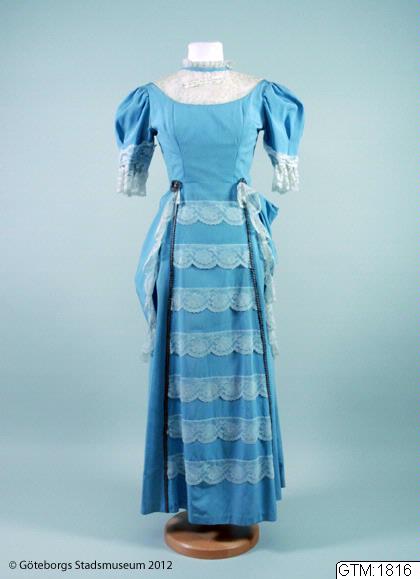 "Klänning i ljusblått ripssiden med vita spetsar 139 cm lång. Klänningen knäpps i ryggen med tryckknappar och dragkedja. Framvåden är dekorerad med spetsband och våden är kantad med silverband, avslutad med en kokard av bandet. Turnyr-arrangemanget är fäst under kokarden, delad i ryggen. Foto rinns." //ur katalogkort lzg 2011-10-24 Stämpel i fodret intill halsöppningen: "FOLKTEATERN, Järntorget, ...