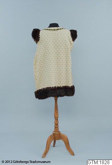 Jackan har slits i sidorna och kring nederkanten och på axlarna är banddekorationer i brunt och brun päls monterad.