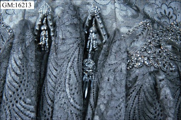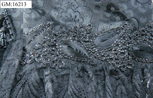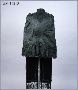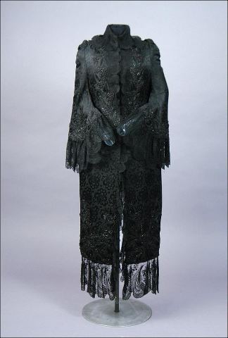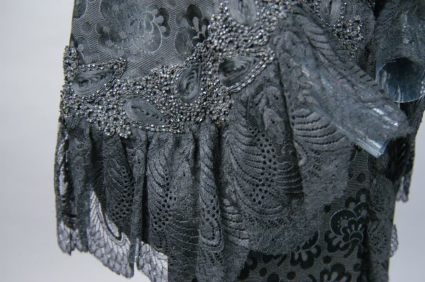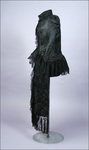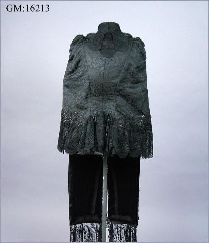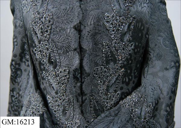 Dolma i svart brokadsiden. Besättning av silkesnodder och svarta glaspärlor. På hanken: " J.A. Wettergren & co. Göteborg". Livband märkt med en bikupa och J.A. Wettergren & Co Göteborg. Längd livet 53 cm, längd framv. 100 cm.