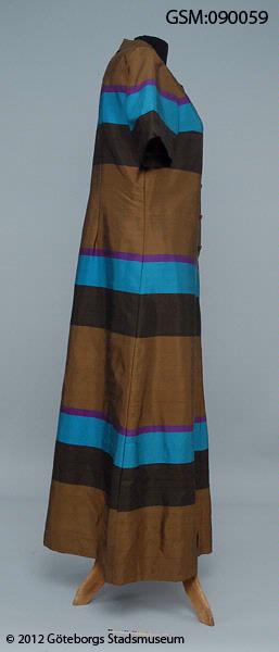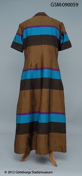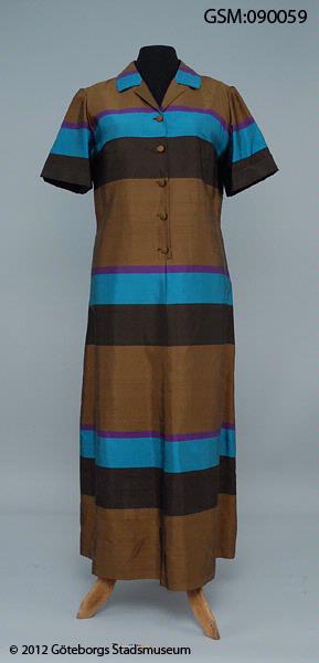 • afonklänning i tvärrandigt taisiden, skjortblus med kort ärm, fem klädda knappar fram, paspoallerade knapphål, sydd hos Wallin, Göteborg.
