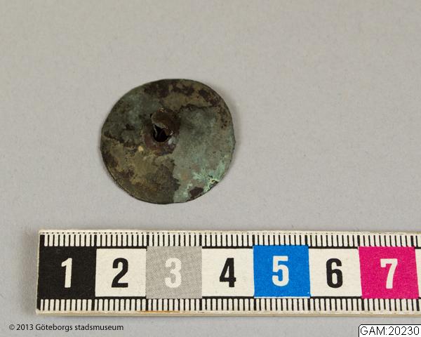 • "Buckla av brons, rund, med sprint, 2.7 cm i diameter." [Ur liggare]