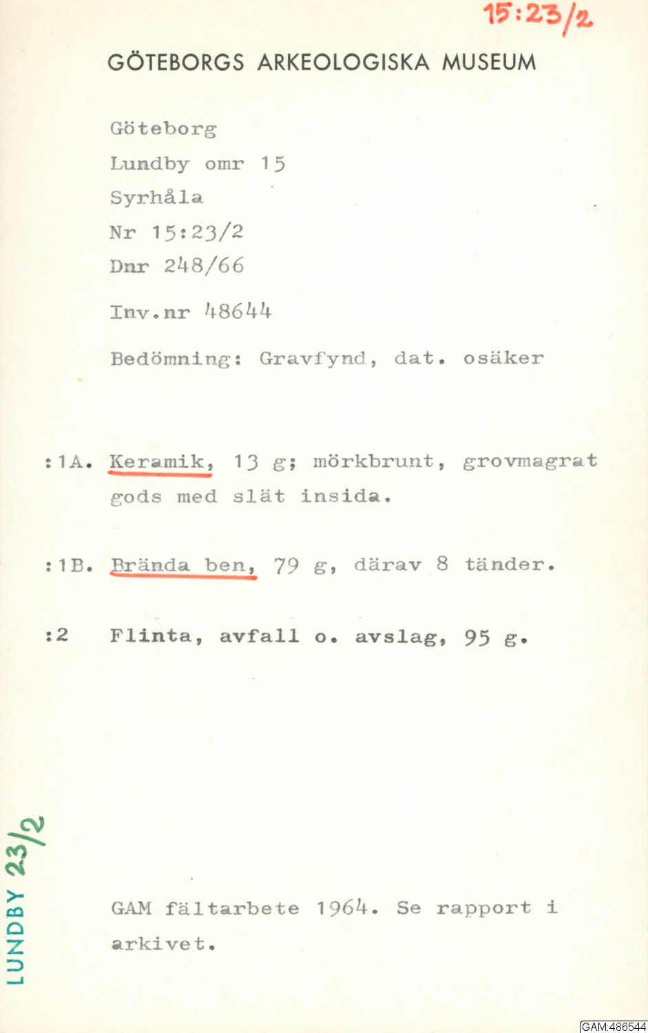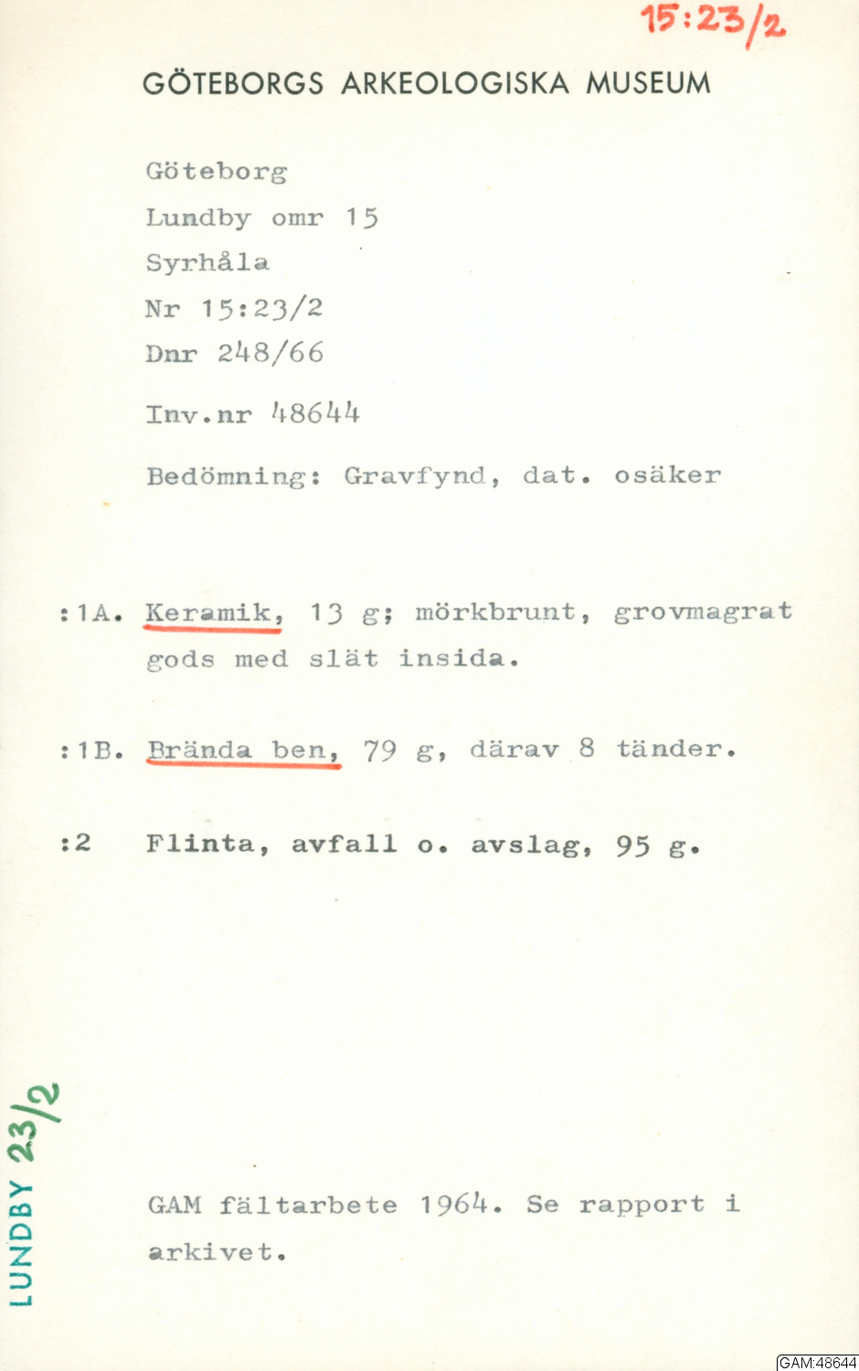 Hittad 1964-07-29 - 1964-08-06 i Göteborg, Lundby, Västergötland, Sverige, Europa av Andersson, Stina, arkeolog.