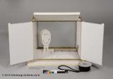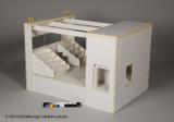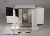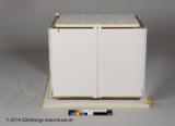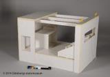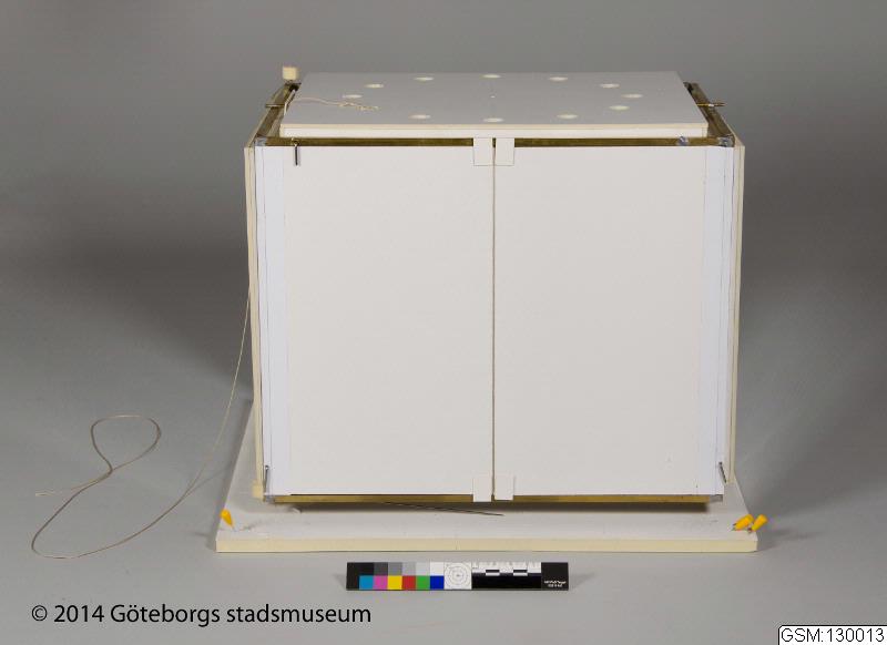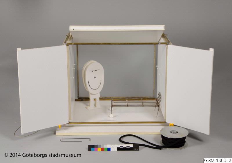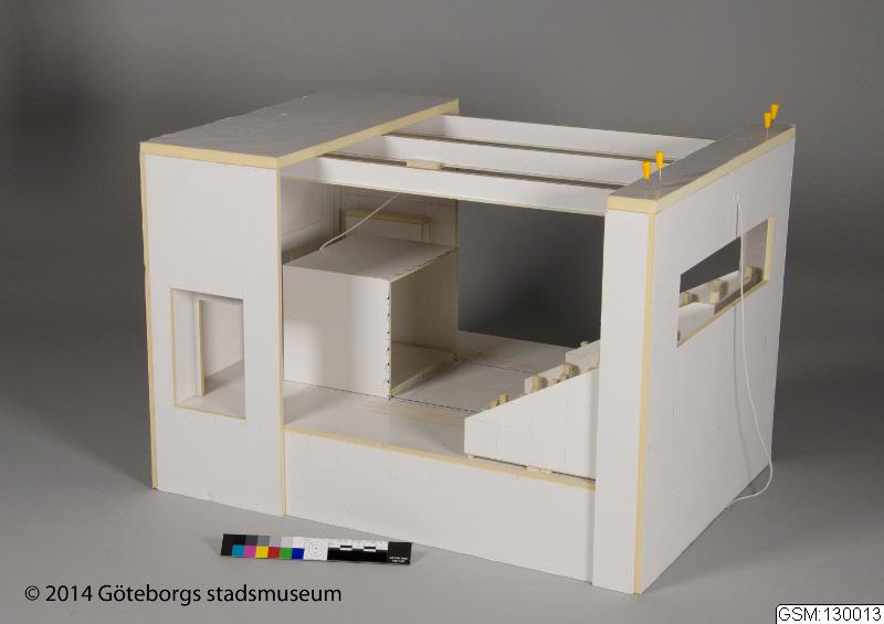 Scenmodeller av Sören Brunes för Folkteaterns uppsättning Det röda trädet 2013. Består av flera delar: 1) modell av hela scenen inkl box; 2) inre öppningsbar scen, "box"; 3) platta; 4) lös docka; 5) säng; 6) rulle med snöre