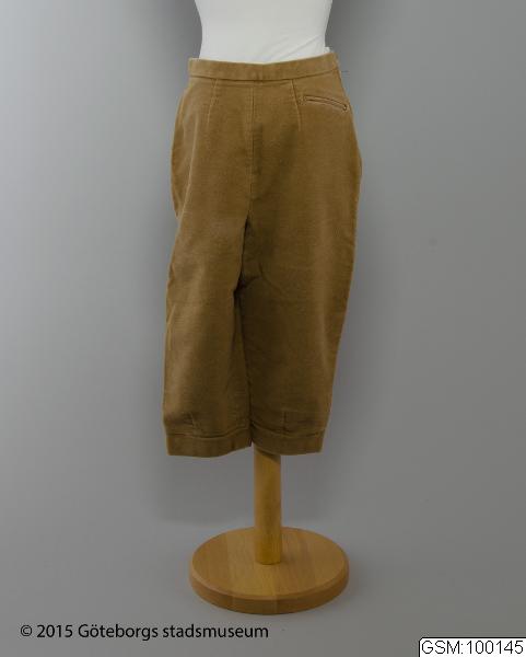 Knäkorta skidbyxor i brunbeige bomullssammet. Byxorna knäppes under knäet med ett enkelt spänne. Byxorna har insnitt och linning och knäppes i sidan med dragkedja och knapp. Byxorna har även en bakficka med blixtlås placerad högt upp vid ena höften.