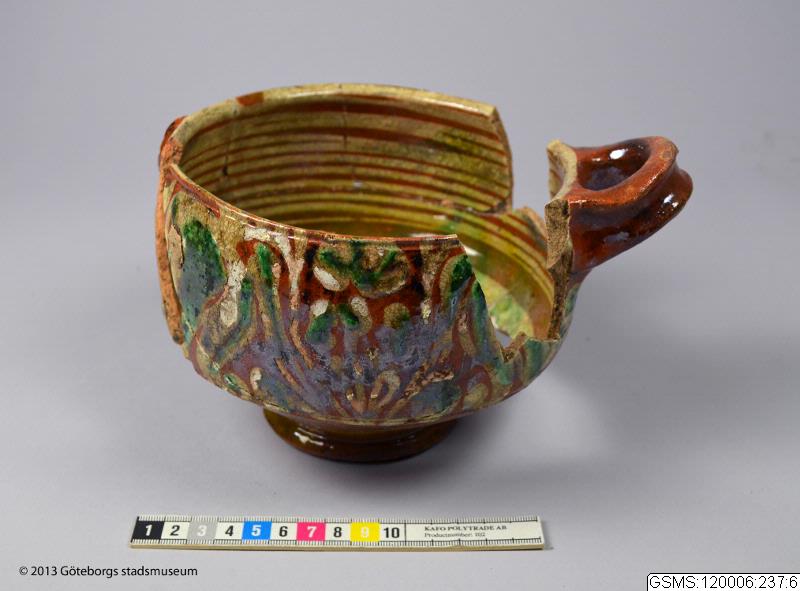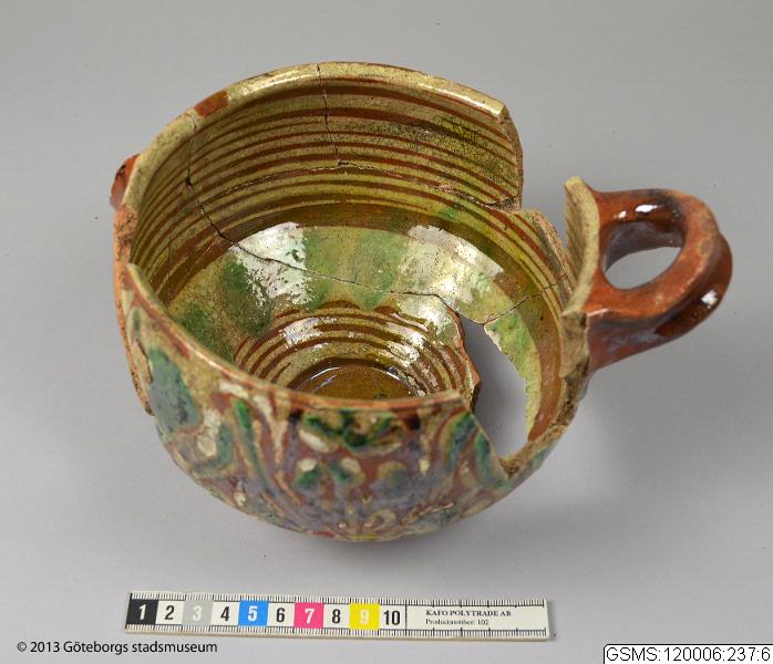 Skål i yngre rödgods, hopsatt av skärvor från fynd nr 237. Ej komplett. Har haft två hänklar, varav en saknas. Insidan har ringlad dekor och mynningskanten blomstermotiv (tulpan) i piplera. Drejfåror på buken.