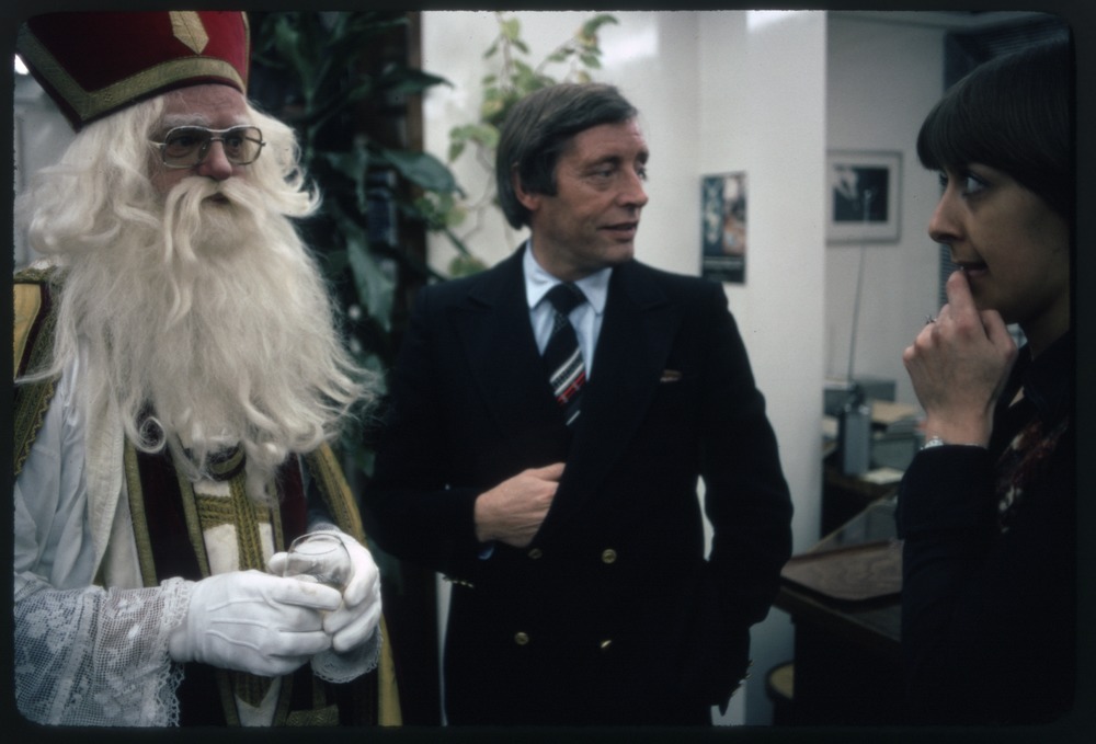Fotografi som avbildar Sinterklaas tillsammans med en kvinna och en man. Sinterklaas firas bland annat i Nederländerna, Belgien och delar av Frankrike. Var och när denna bild är tagen är osäkert men möjligen i Belgien eller Frankrike på 1980-talet.