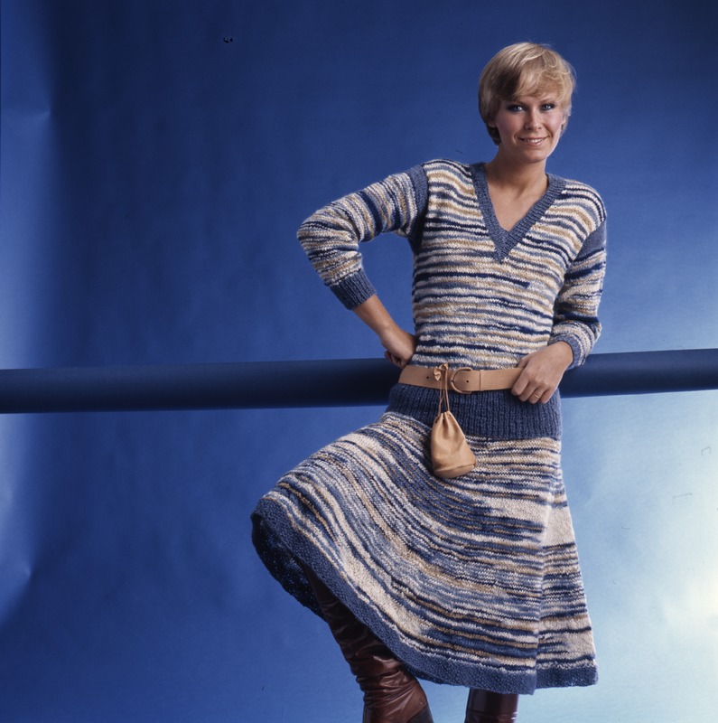 Bilden föreställer en kvinna fotograferad inomhus i dryg trekvartsfigur mot blå bakgrund. Kvinnan lutar sig mot ett blått rör i midjehöjd. Kvinnan har på sig en två delad stickad klänning med lång ärm. Garnet är randigt vitt och blått och klänningens kanter är enfärgat blå. Kvinnan har ett beige skärp i midjan i vilket hänger en liten väska, till detta också bruna läderstövlar.