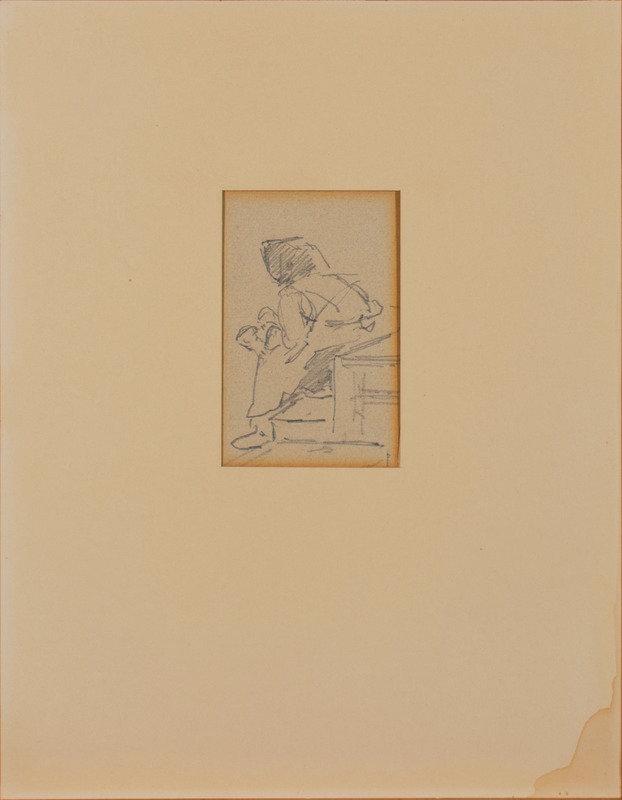 • Från Torekov. Sittande kvinna i huckle bland trälådor. Blyertsteckning på grått lumppapper.