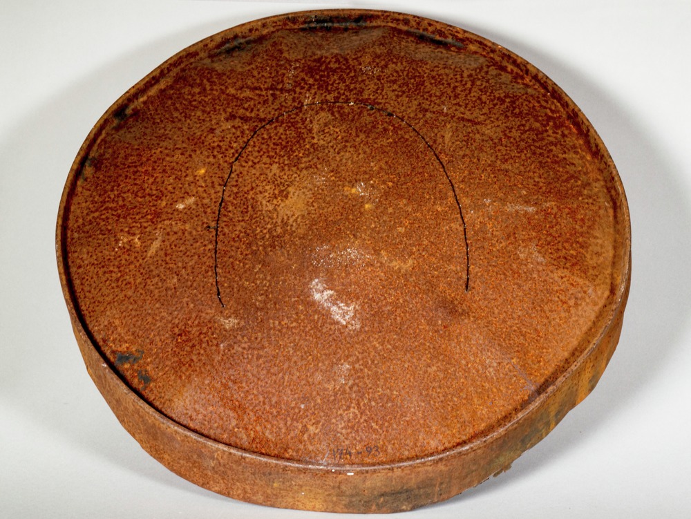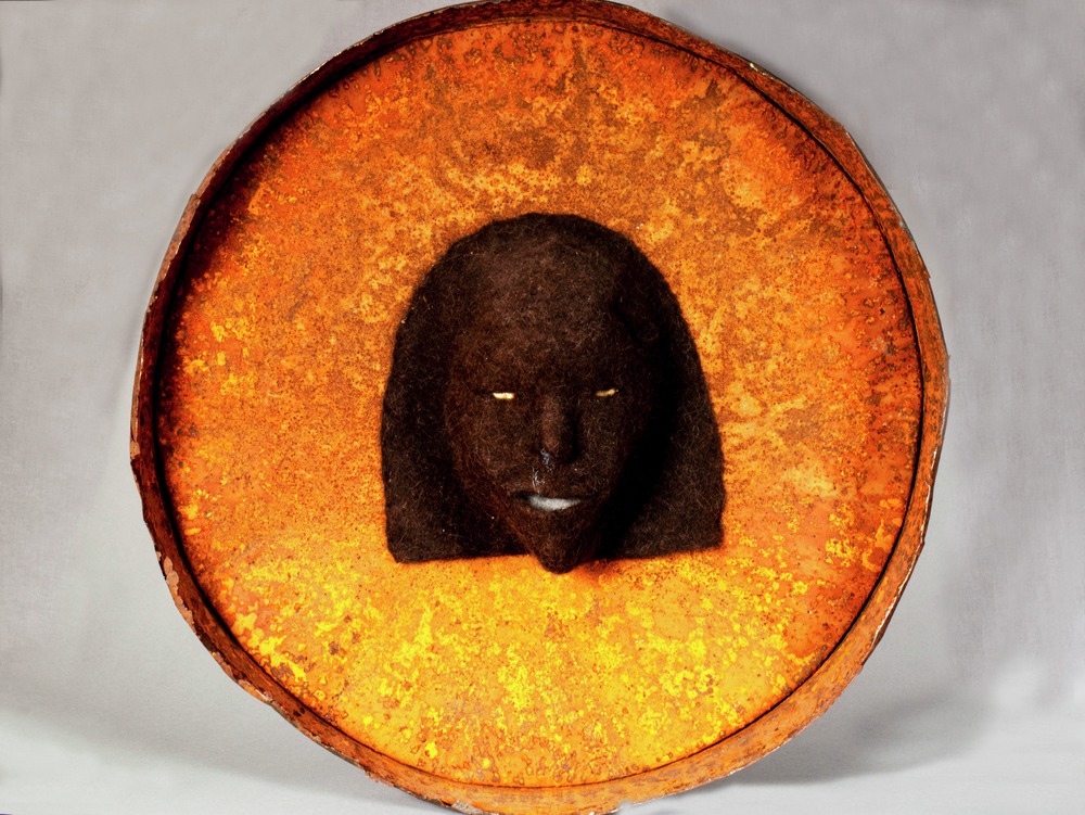• Väggskulptur. Tovad mask i cirkel, rostig tunnbotten.